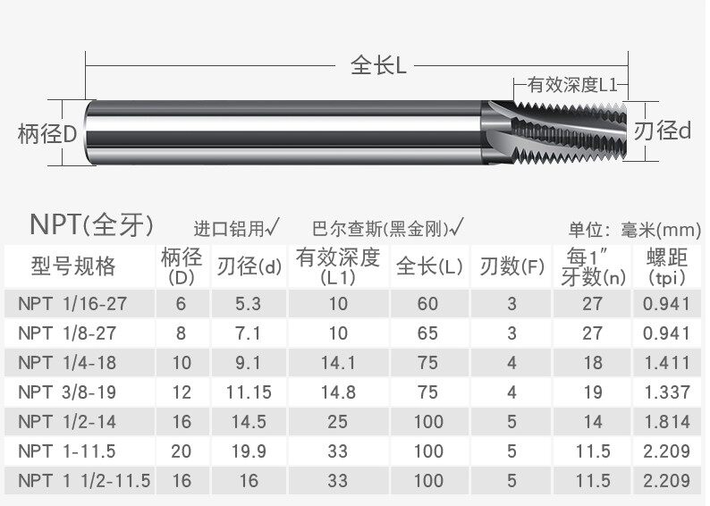 NPT Tungsten Steel Thread Milling Cutt NPTF 60 - degree Cone Thread Milling Cutt