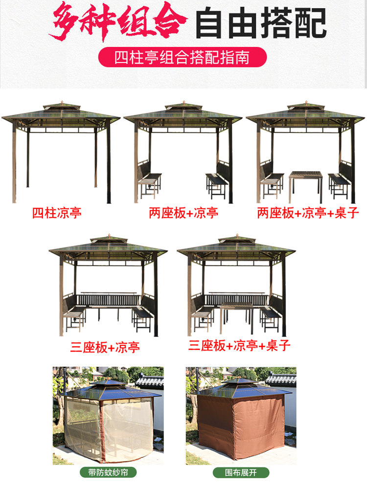 2 5X3m four-column pavilion two-side seat board table 2 5X2 5-meter four-post pavilion two-side seat board 2 5X2 5-meter four-post pavilion three-side seat board table 3X3m4