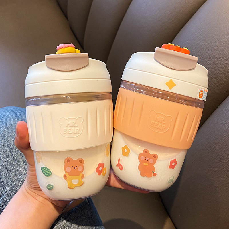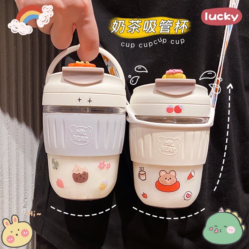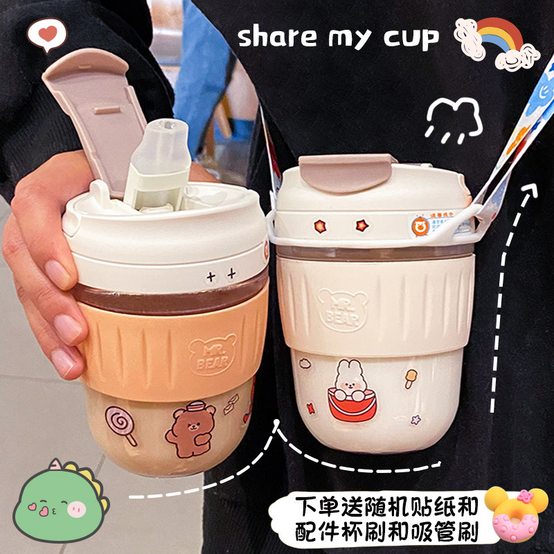 High-value glass cup female simple drinking water cup portable with straw milk tea cup net red cute coffee cup student