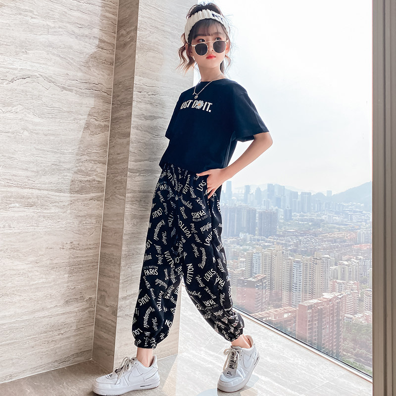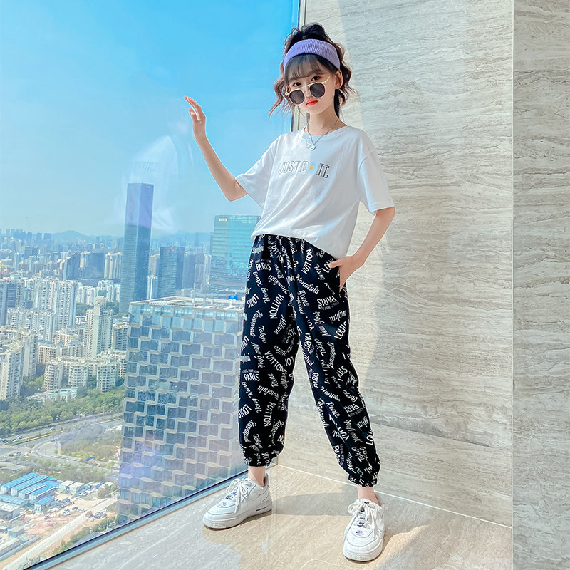 Girl Summer Clothing Nets Red Suit Foreign Pie 2022 New Korean Version Children Summer Short Sleeve Mosquito-Proof Pants Sports Two Suits