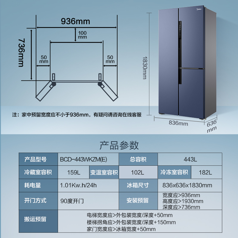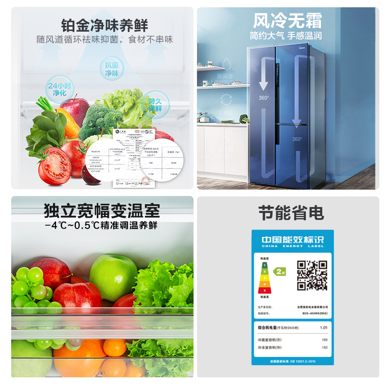 Midea 443L oppositve T-type three-door multi-door frequency conversion air-cooled frost-free large-capacity intelligent household refrigerator