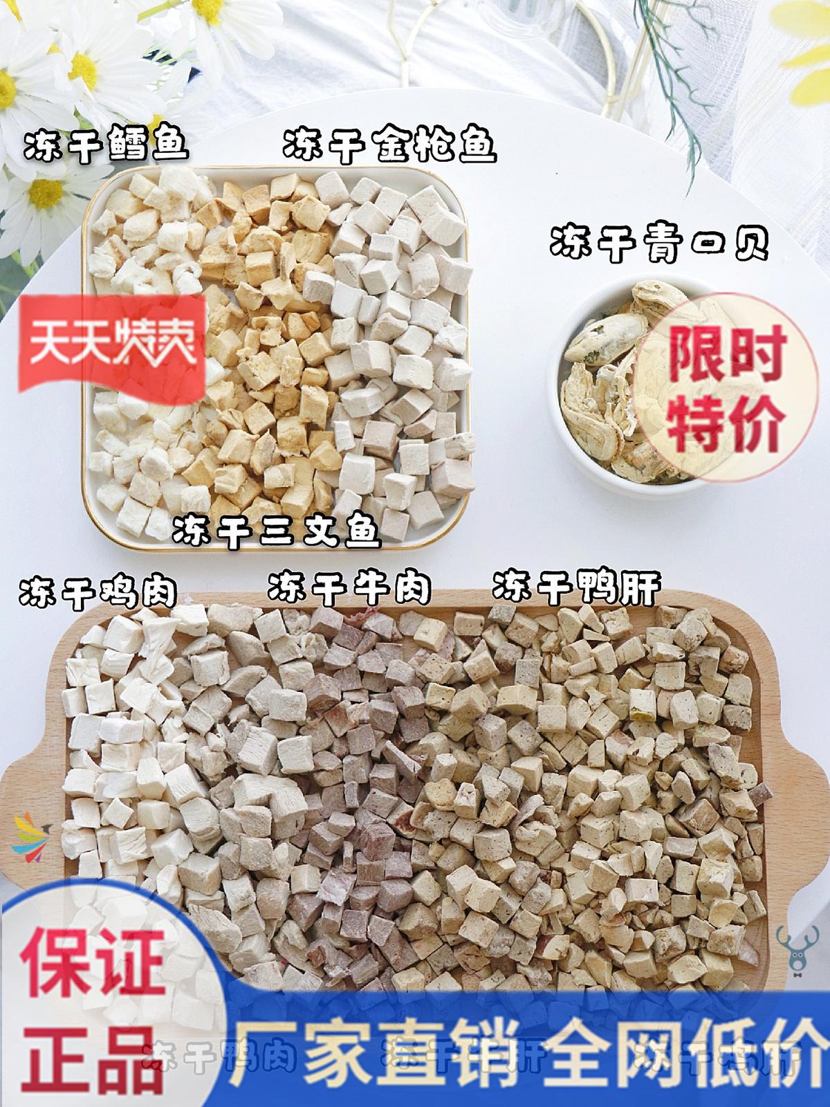 Freeze-dried chicken 120g Freeze-dried duck 110g Freeze-dried salmon 110g Freeze-dried cod 60g Freeze-dried chicken liver 120g Freeze-dried duck liver 130g Freeze-dried mussels 80g Freeze-dried tuna