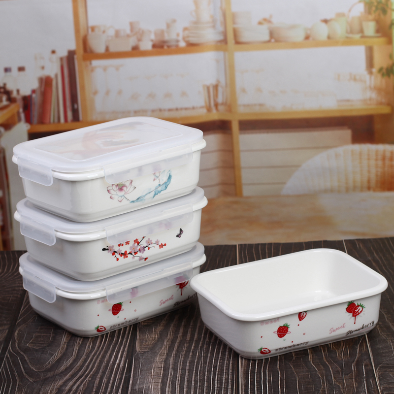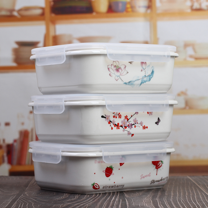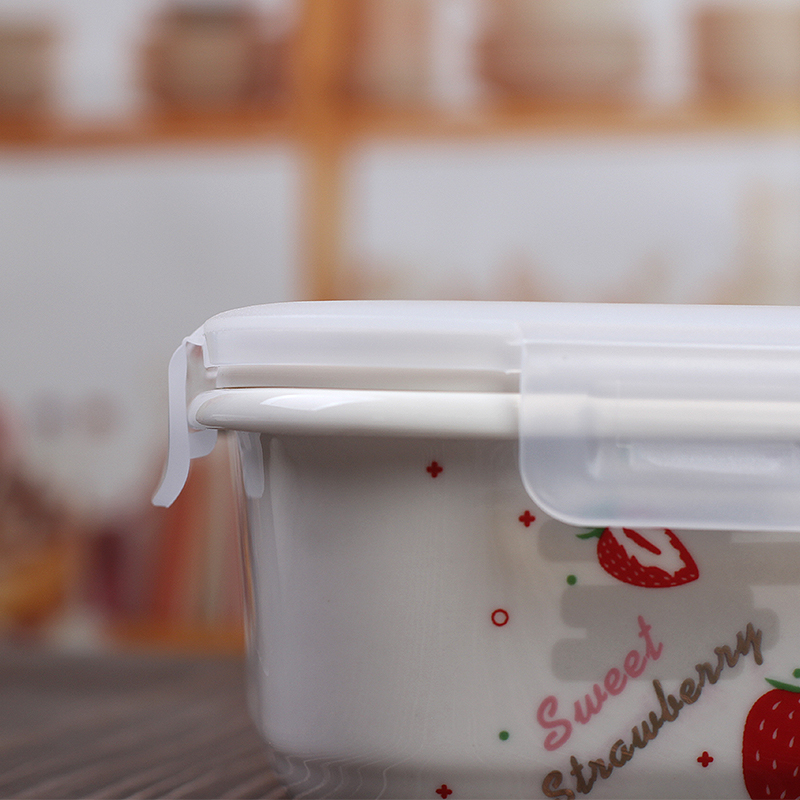 Original Flavourism Ceramic Rectangular Rice Cartridge Rice Bowl with lid handle Microwave Oven Heated Lotus Strawberry
