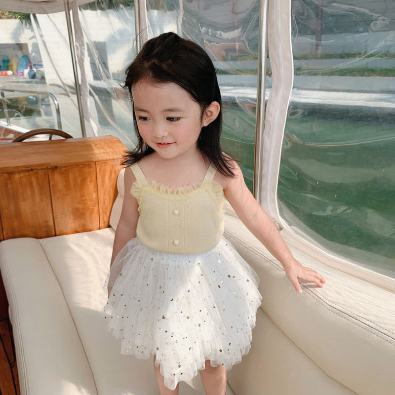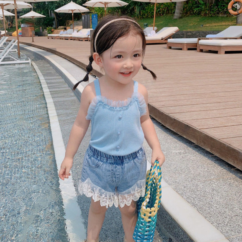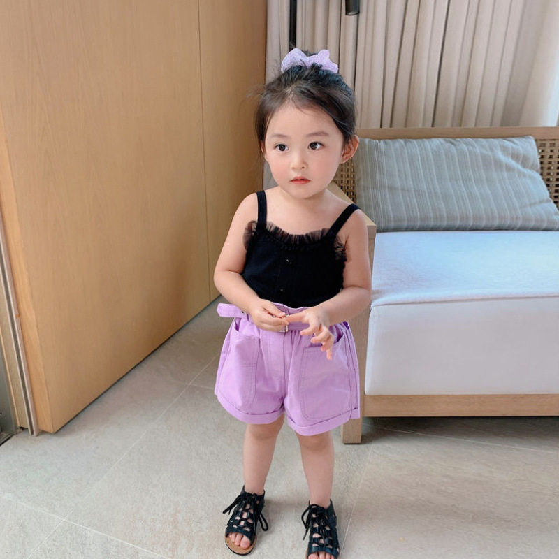 Girl baby 2022 summer new girl wool fresh gas sling with Han - paste lotus edge hanging shirt