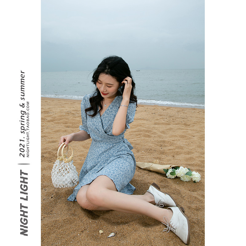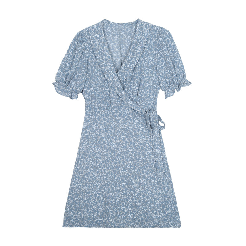 One-piece crumbled with female summer lotus leaf lace with foam sleeves Short skirt V necklace with waist high waisted blue dress