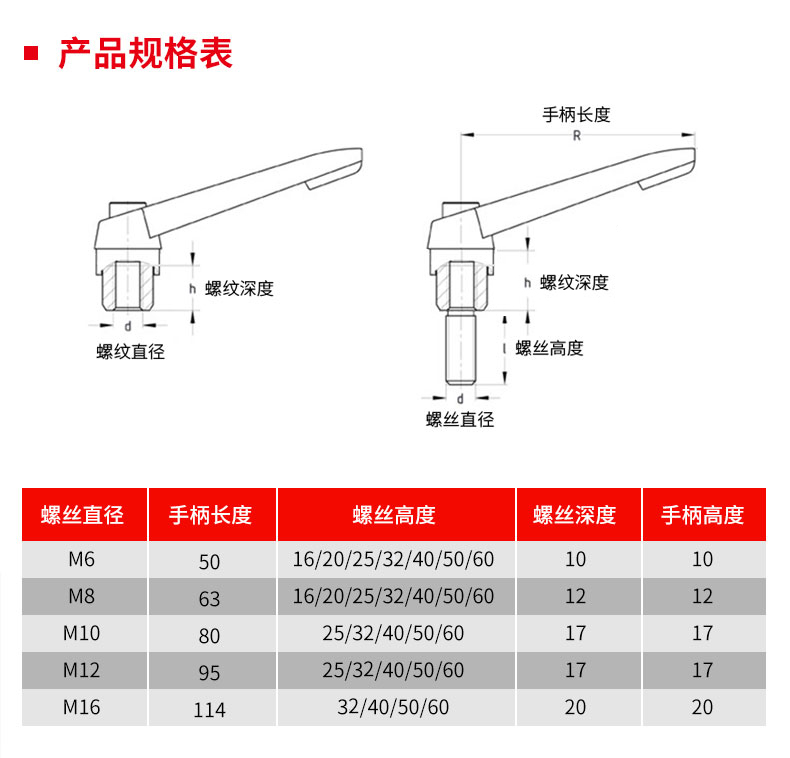 Internal thread M5 (handle length 50) internal thread M6 (handle length 50) internal thread M8 (handle length 63) internal thread M10 (handle length 80) internal thread M12 (handle length 9
