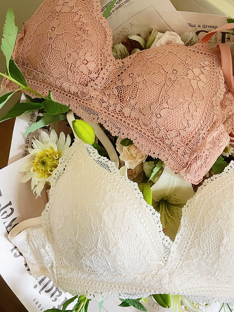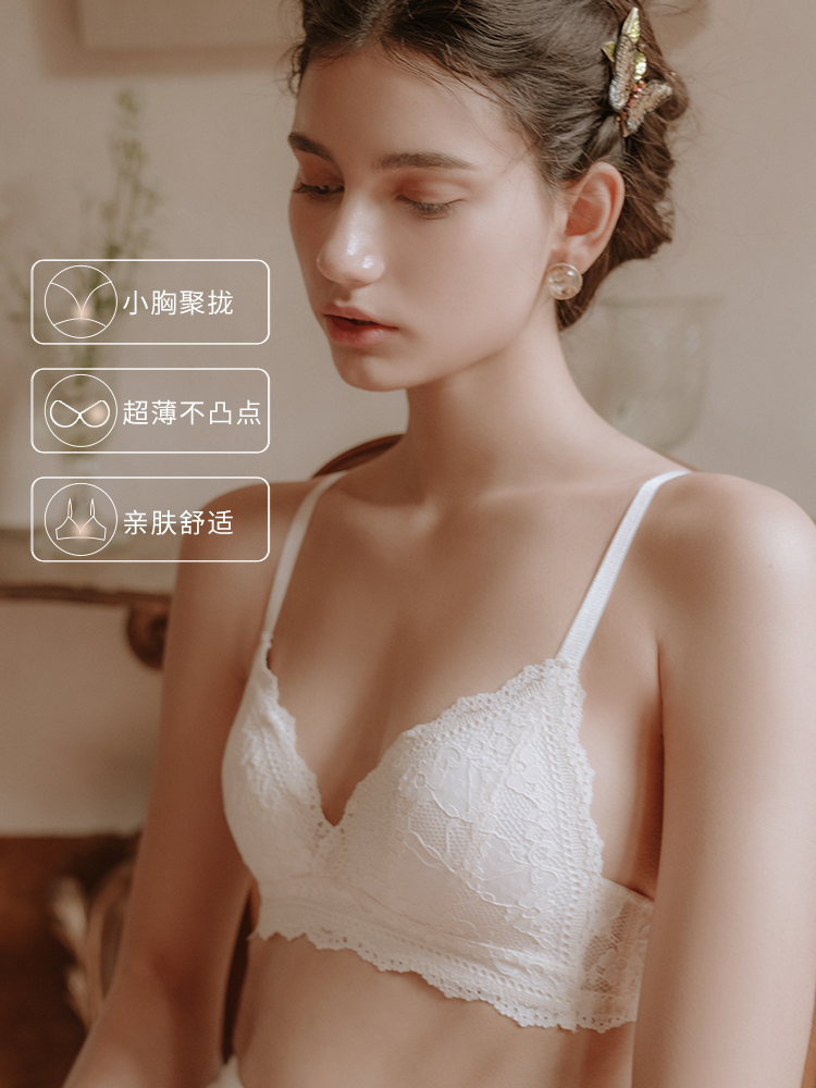 Sixth floor French underwear women's triangle cup bra lace without steel ring small chest gathering summer ultra-thin bra set