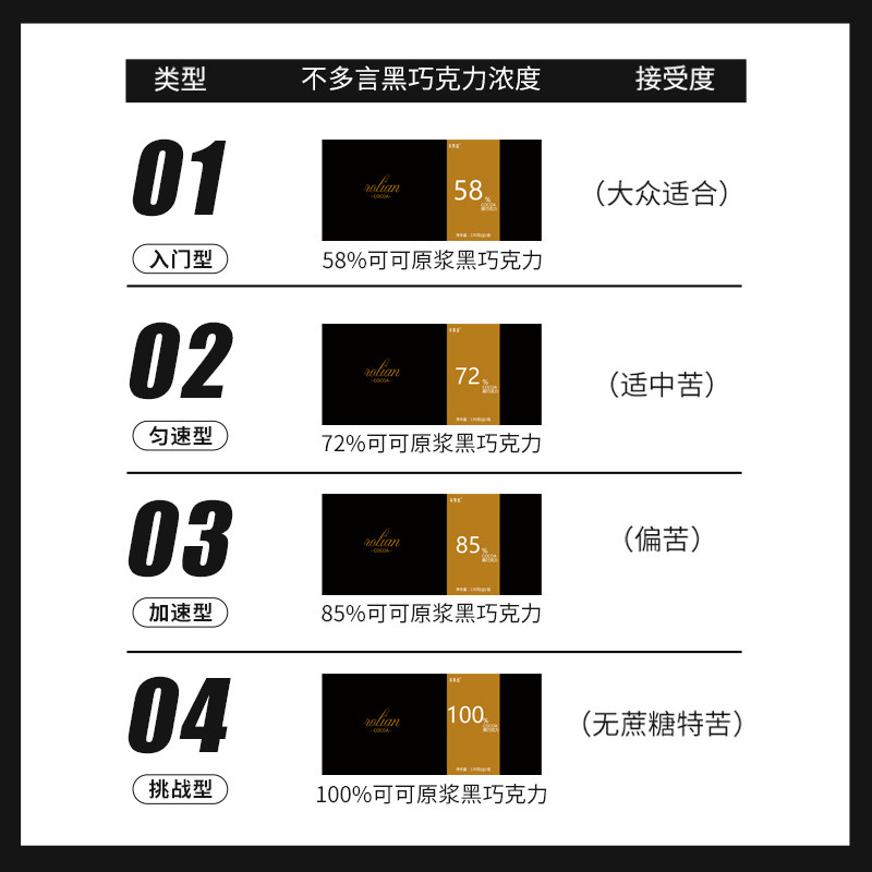 Entry type (58% cocoa content dark chocolate) 3 boxes about 78 bags uniform type (72% cocoa content dark chocolate) 3 boxes about 78 bags accelerated type (85% cocoa content Black