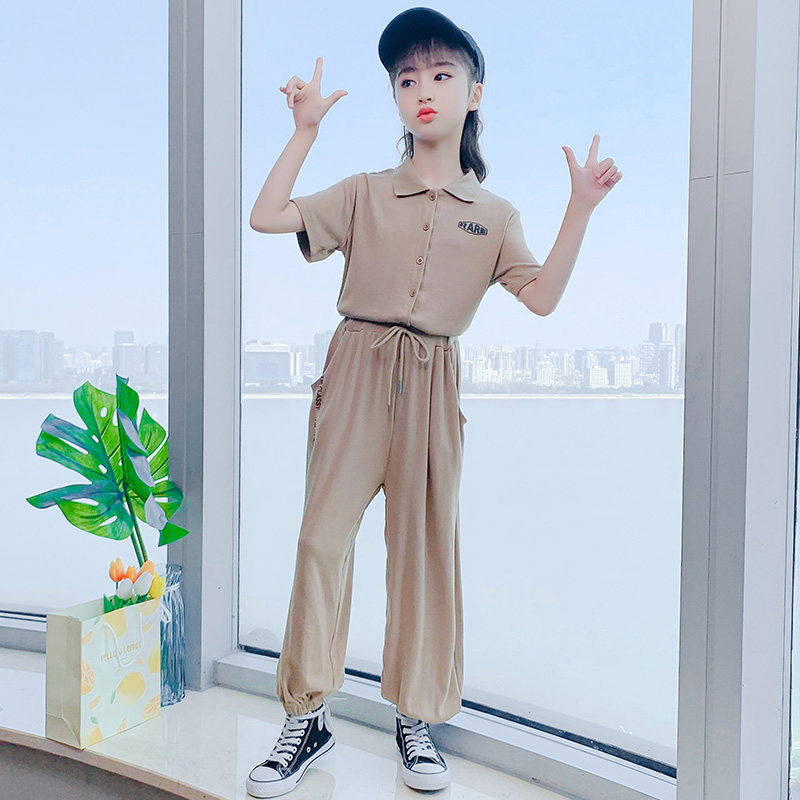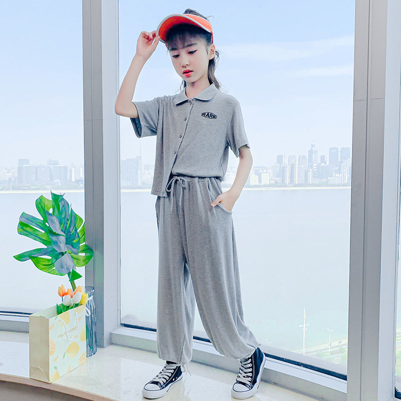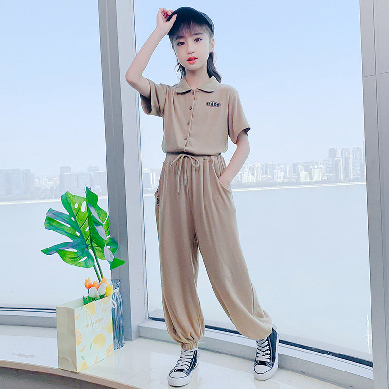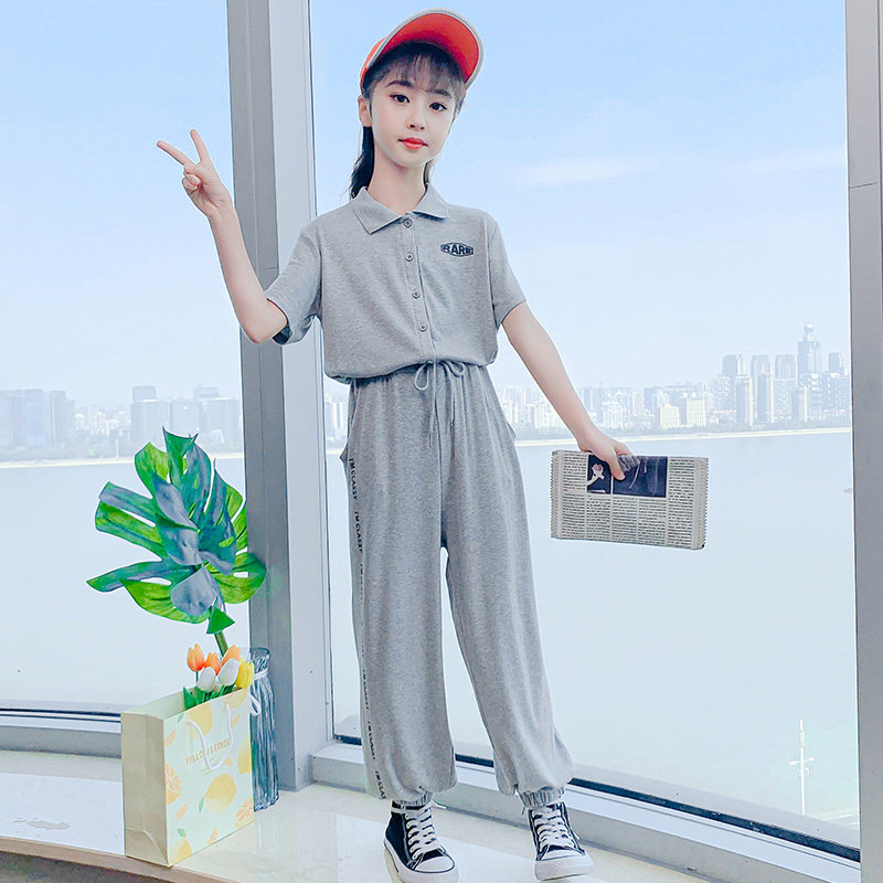 Girls Summer Set 2022 Han Edition of the large children's sweater button short - sleeved high waist alphabet with two - piece sets