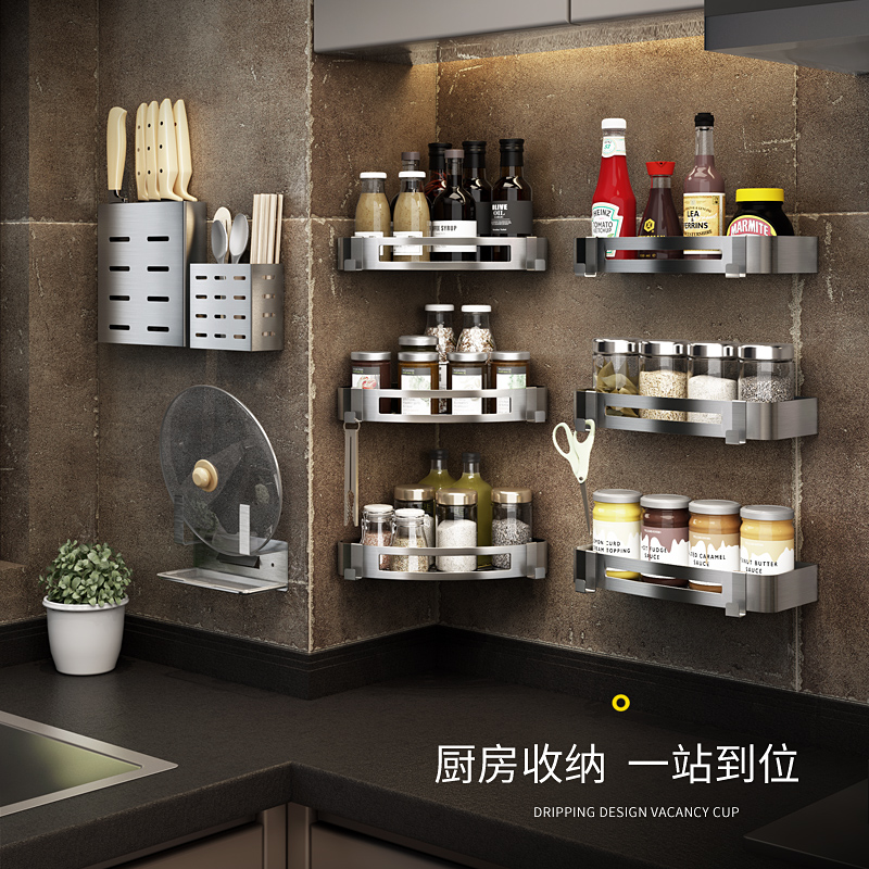 Stainless steel kitchen rack free punching wall-mounted hardware pendant seasoning supplies chopsticks knife storage shelf