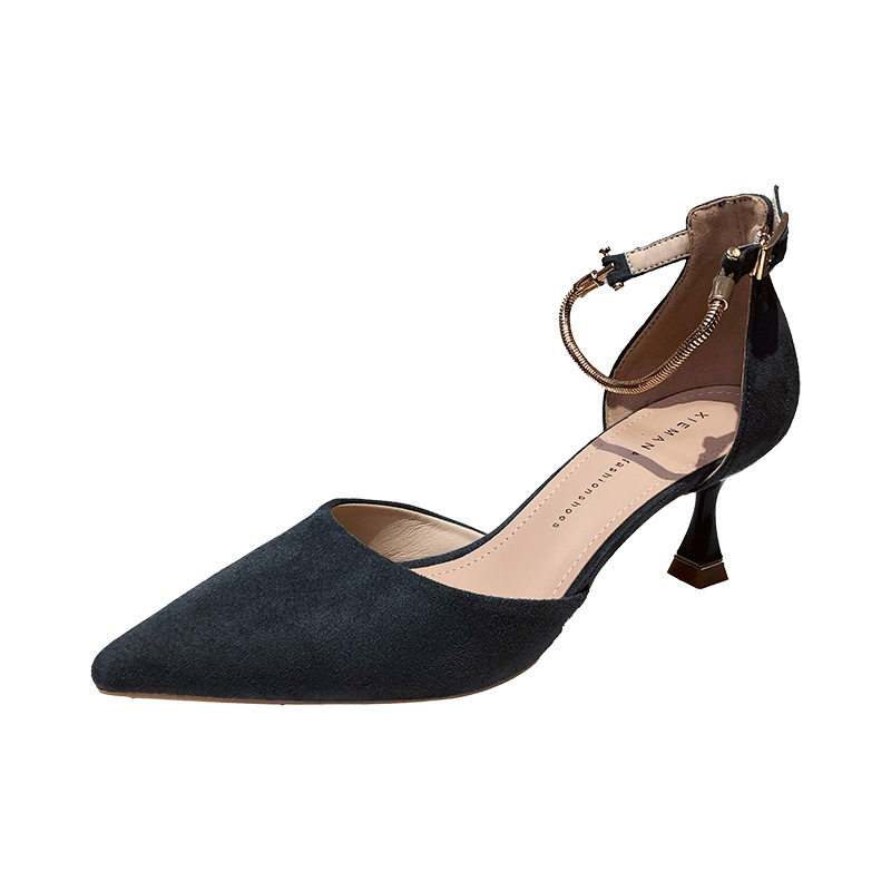 Xi'an high-end single shoes women's 2021 new one-word buckle hollow spring French style medium-heeled pointed high-heeled shoes