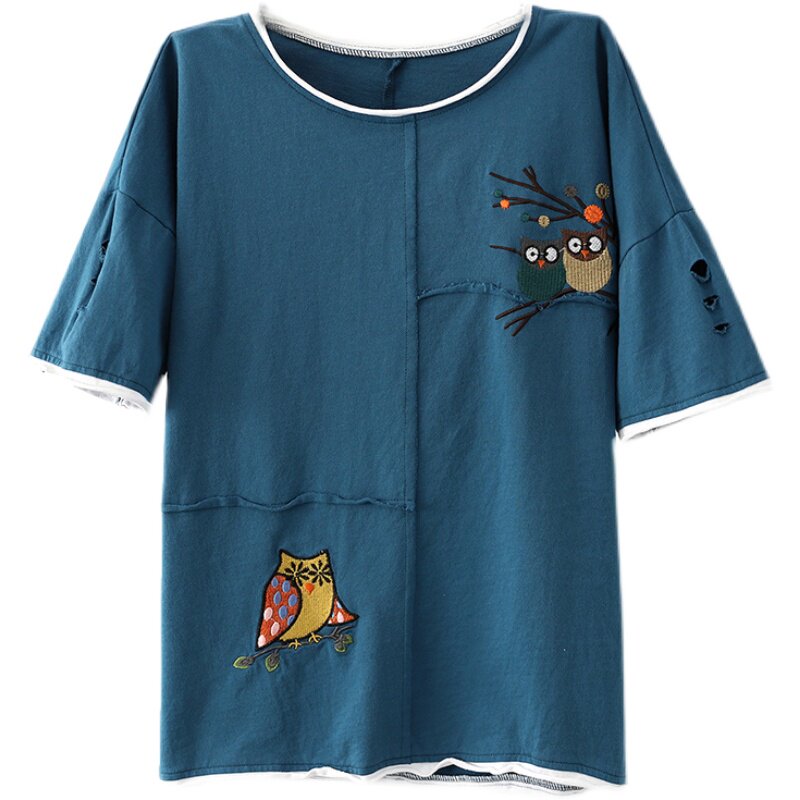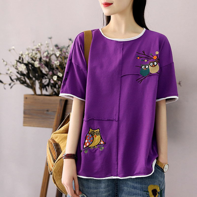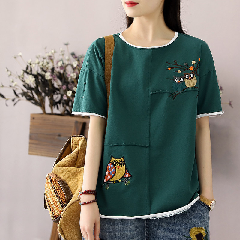 Han Suoyi Retro literary summer women's T-shirt women's short-sleeved design sense niche owl embroidery loose top