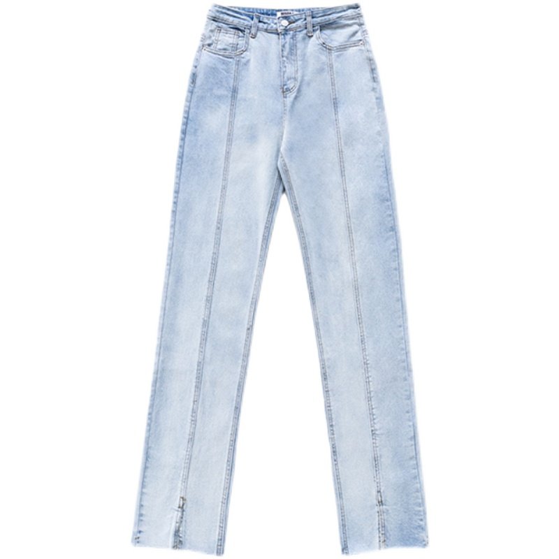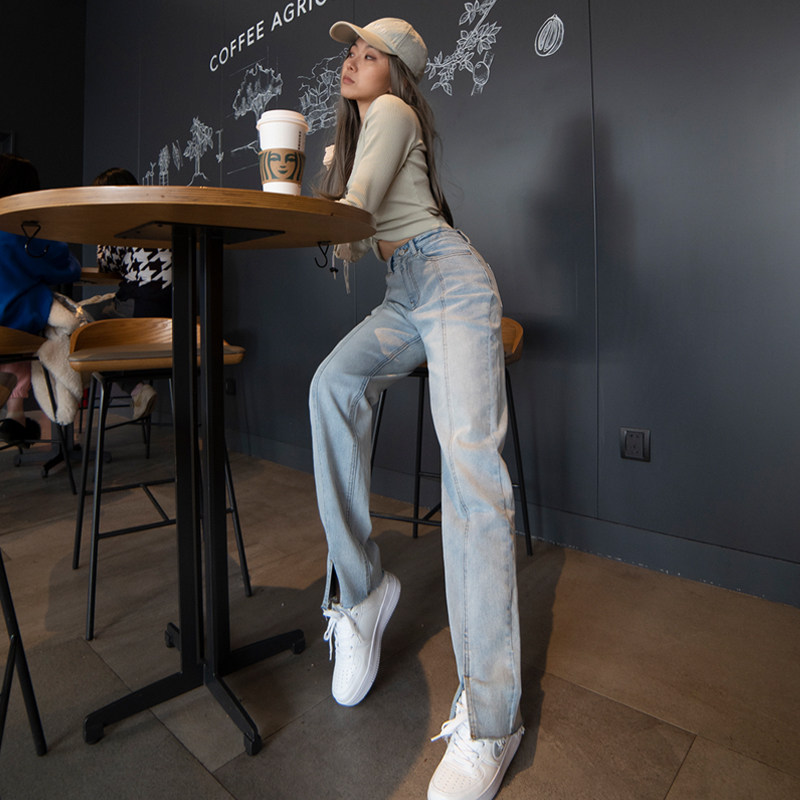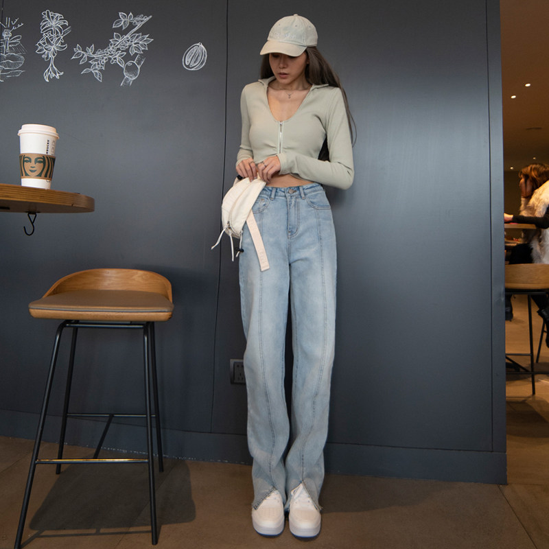 MOONA high waist front slit jeans women's straight loose drape 2022 slim light blue mopping pants