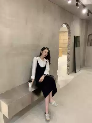 Qiu Meiyao June 1 2020 autumn new V-neck temperament long skirt waist thin sleeveless suspender dress female