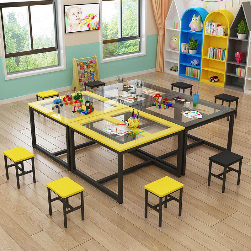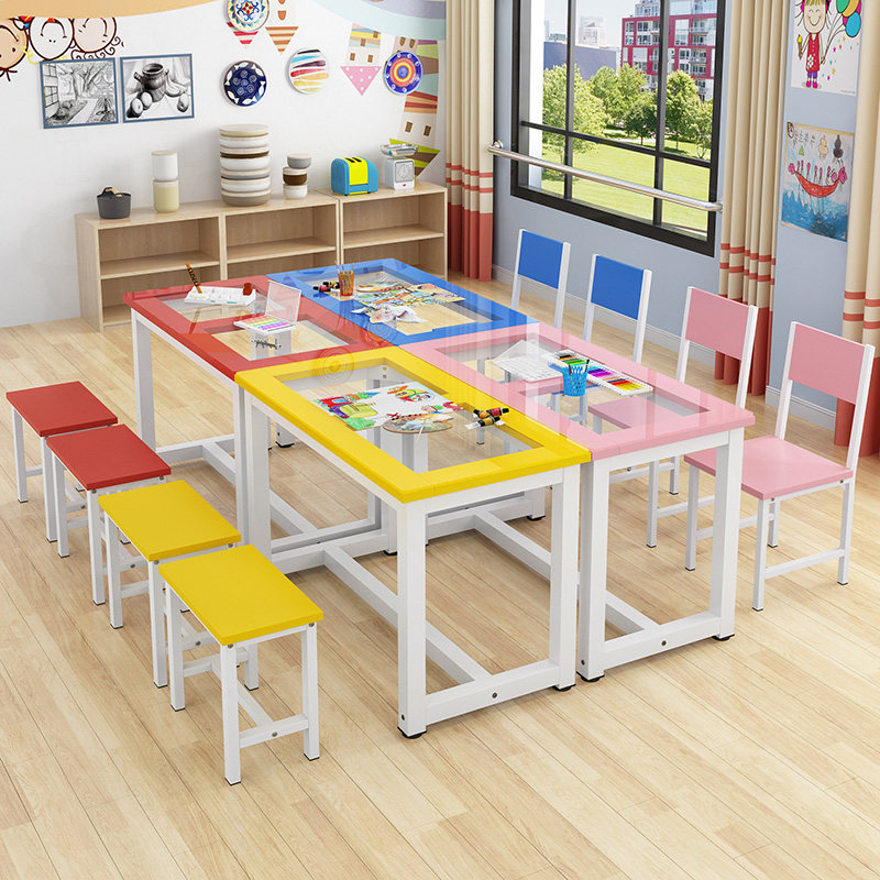 Children Drawing Room Fine Art Glass Painting Double Colored Table And Chairs Elementary School Children Kindergarten Tutoring Training Course Desk And Chairs