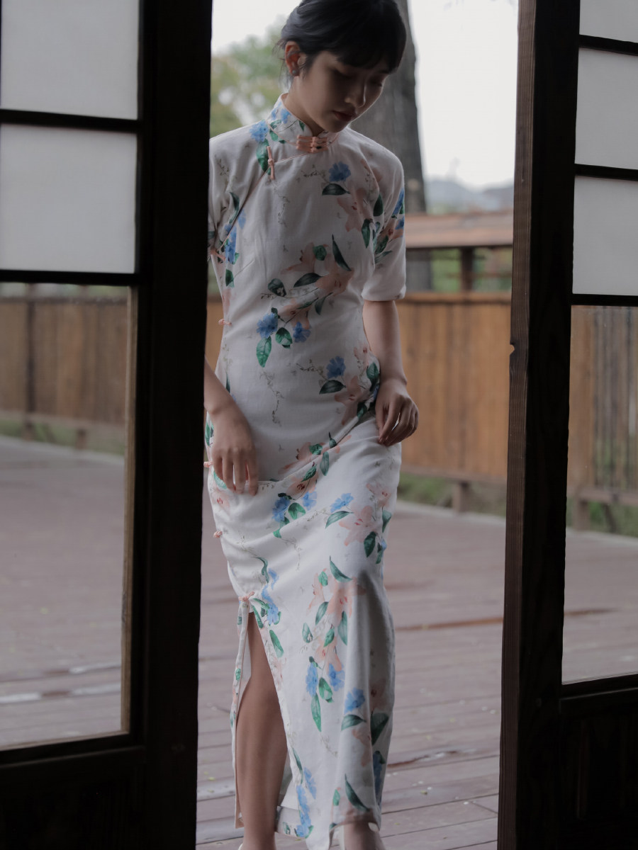 Momo cheongsam spring and summer new products four-point sleeves full open long version of retro daily printing linen cheongsam Lan Ruo