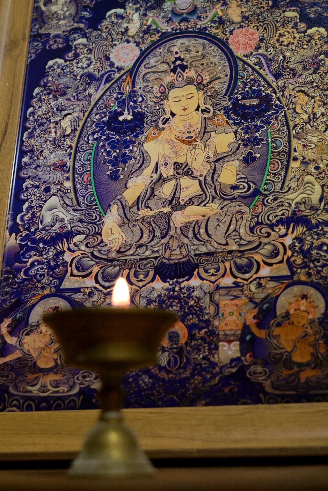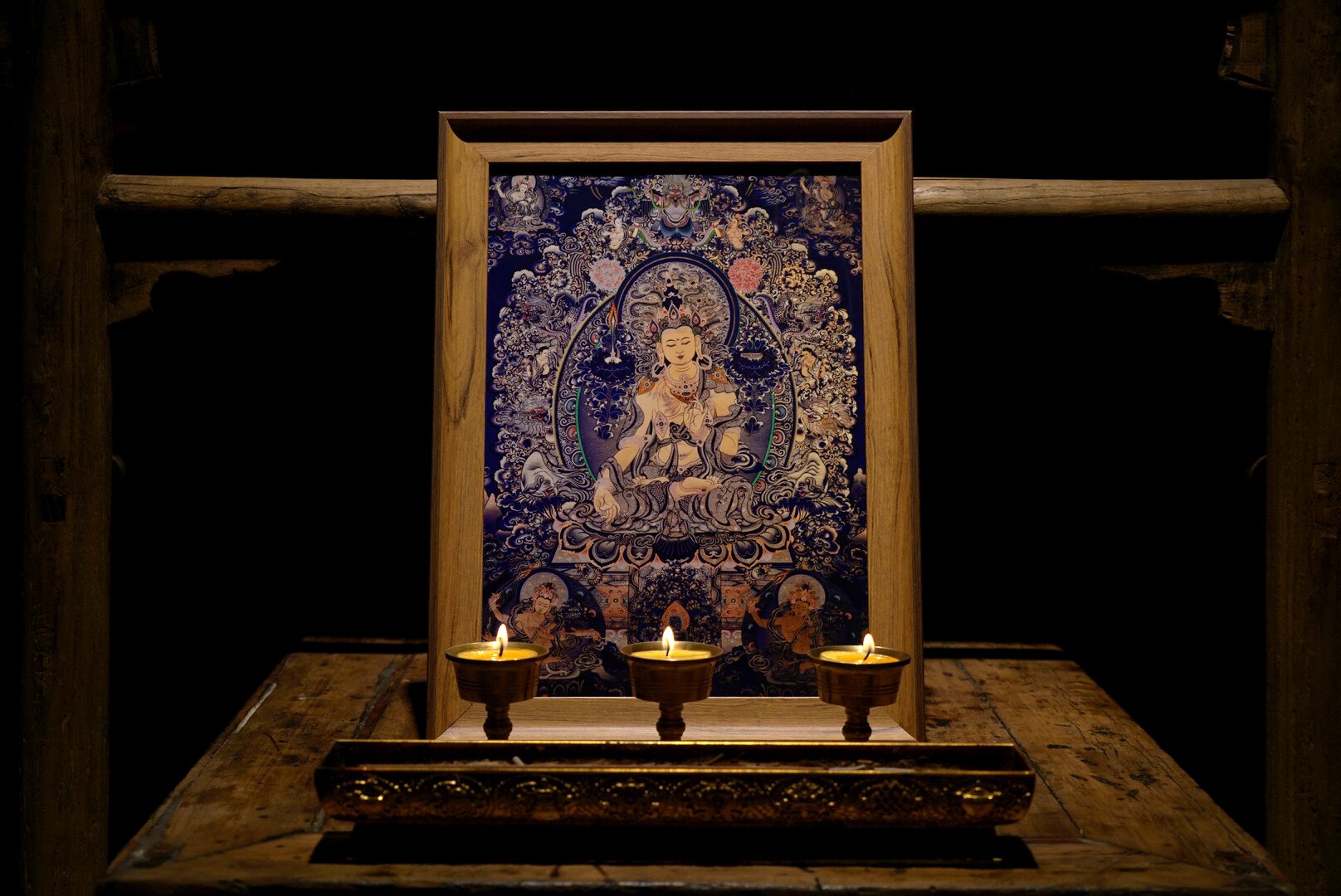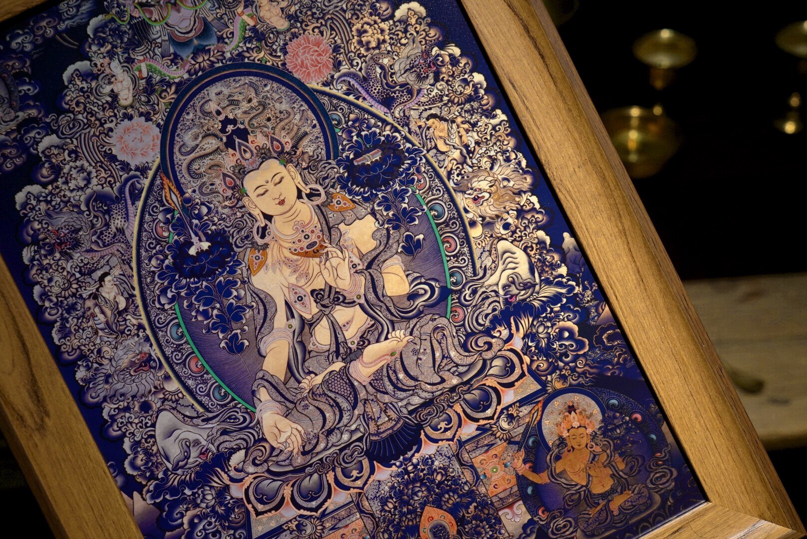 Boutique Limited Edition Re-engraved Color Printing Blue Gold Thangka (Manjusri Bodhisattva) Table Place with Photo Frame