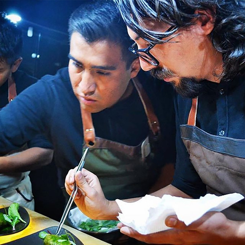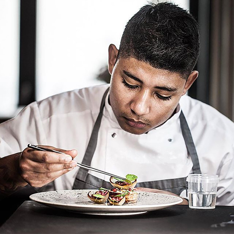 Chef Chinese and Western cold dishes plating decorated with stainless steel tweezers molecular cooking tools sandwich Michelin restaurant