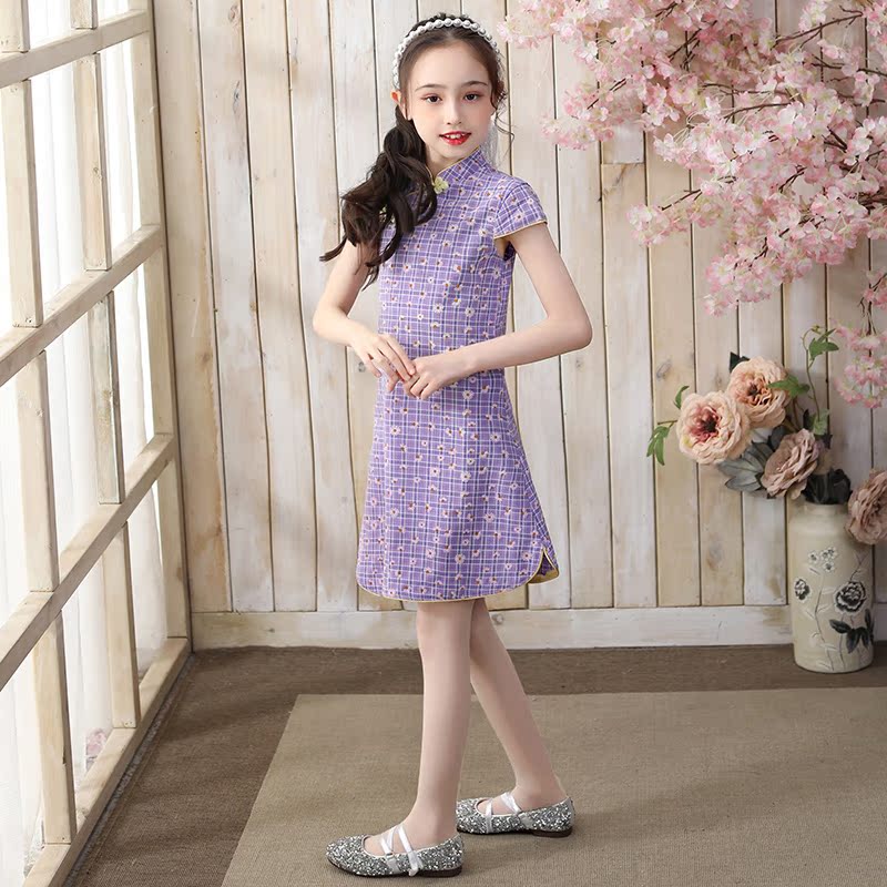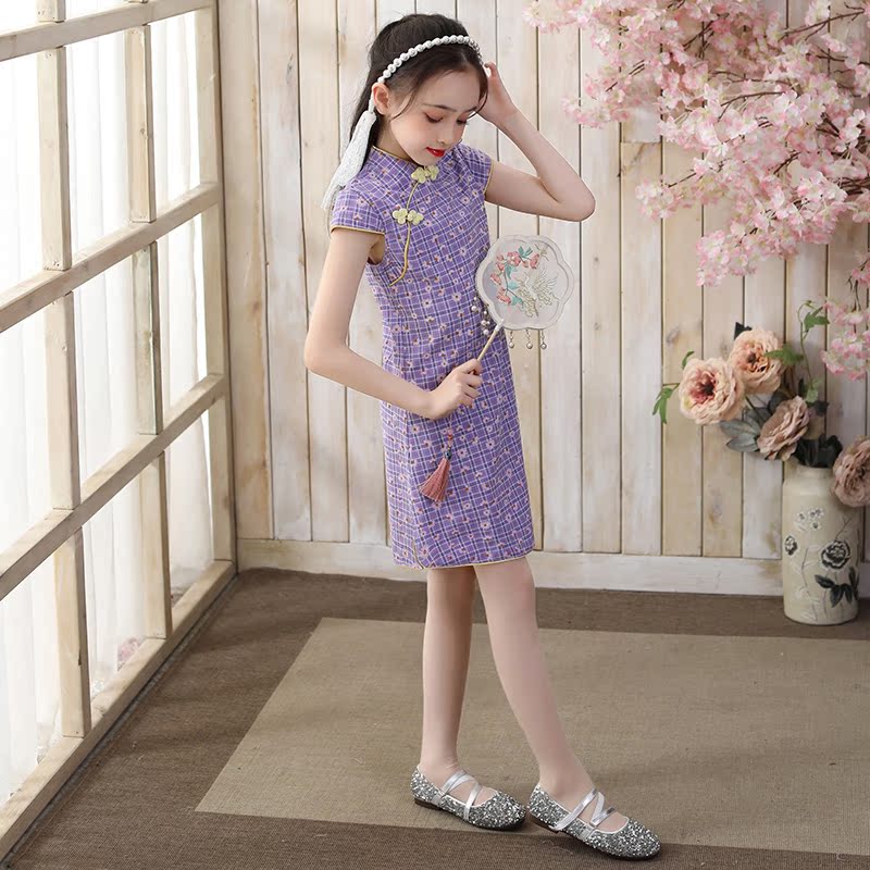 Children's cheongsam autumn little girl Chinese style foreign style girl princess guzheng costume purple plaid dress