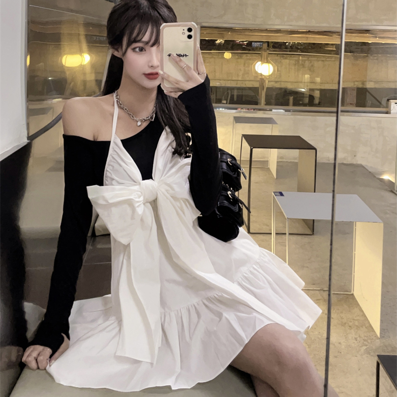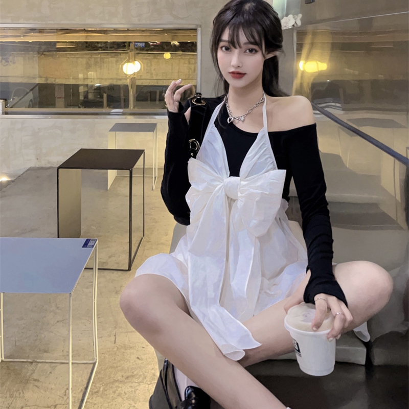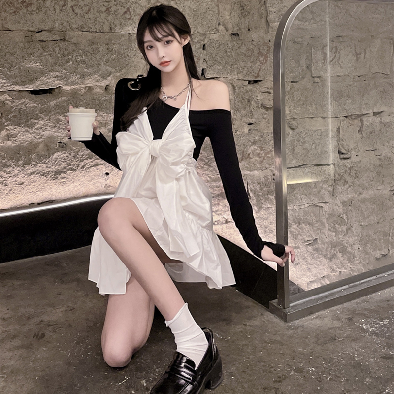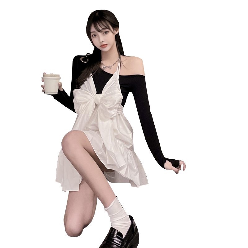French sweet bow neck white dress suspender skirt slanted shoulder single shoulder black bottoming shirt pullover skirt