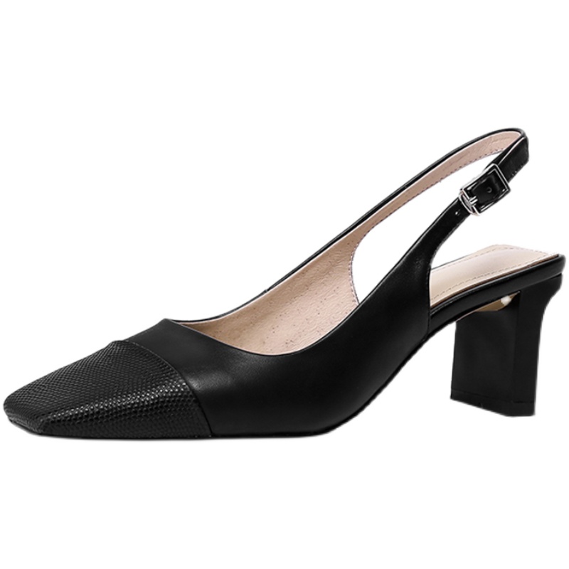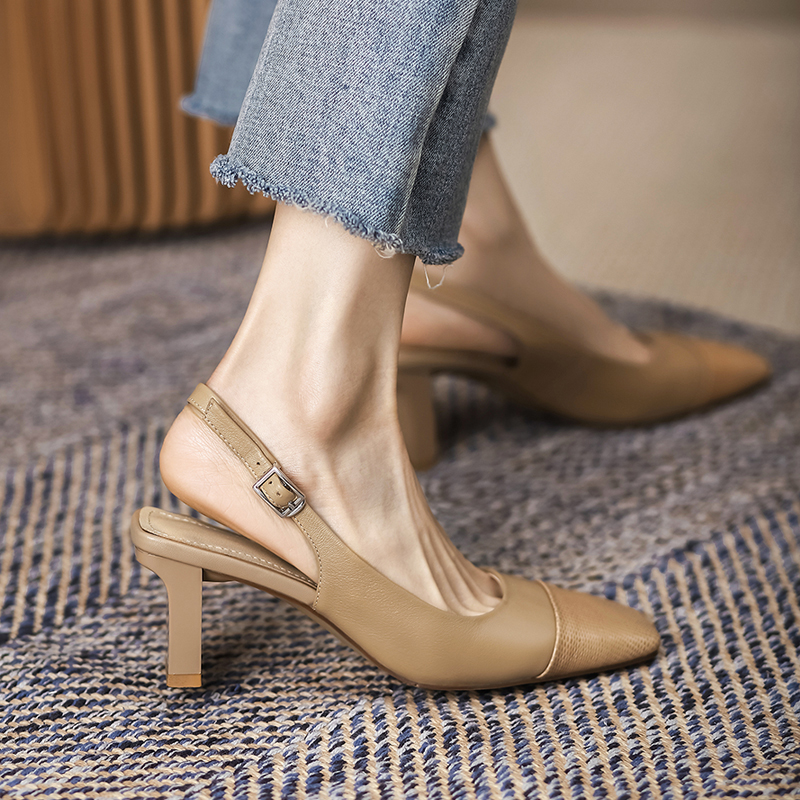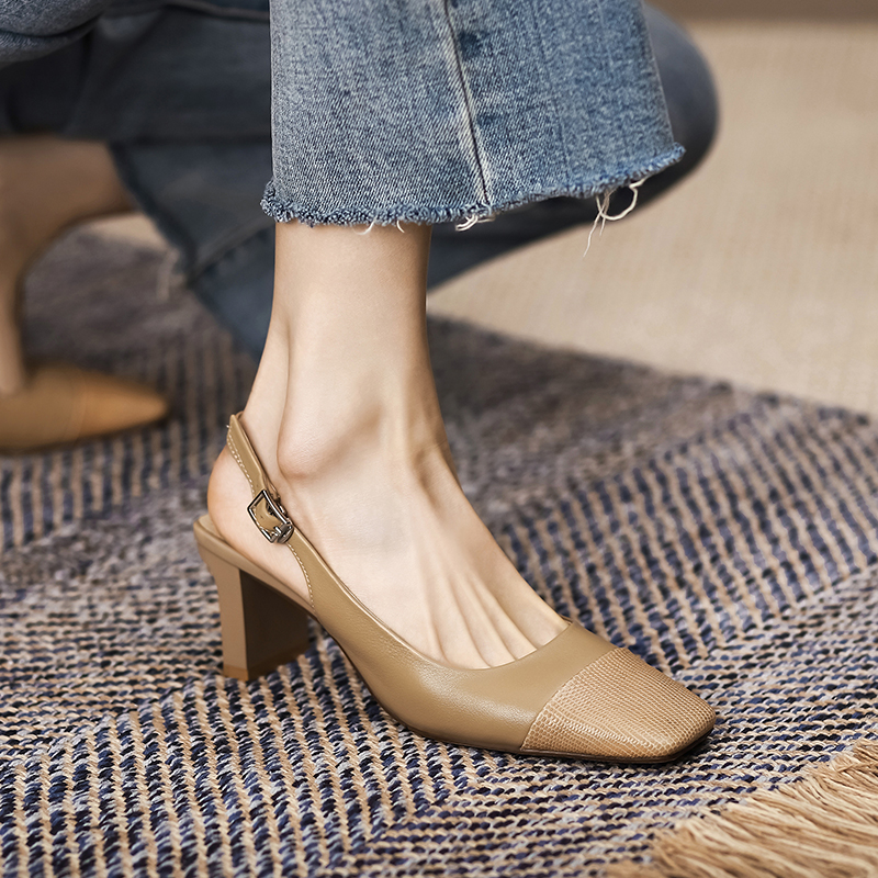 Fashion back empty thick heel leather sandals women's one-word buckle back strap stitching Baotou 2022 spring and summer high-heeled shoes