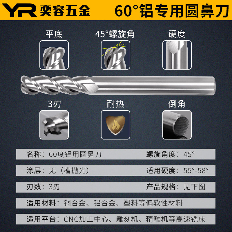 60-degree aluminium with round nose knife tungsten steel ox nose stand milling cutter 3 blades R angle lengthened numerical control alloy cutter 1R0 2-20R4