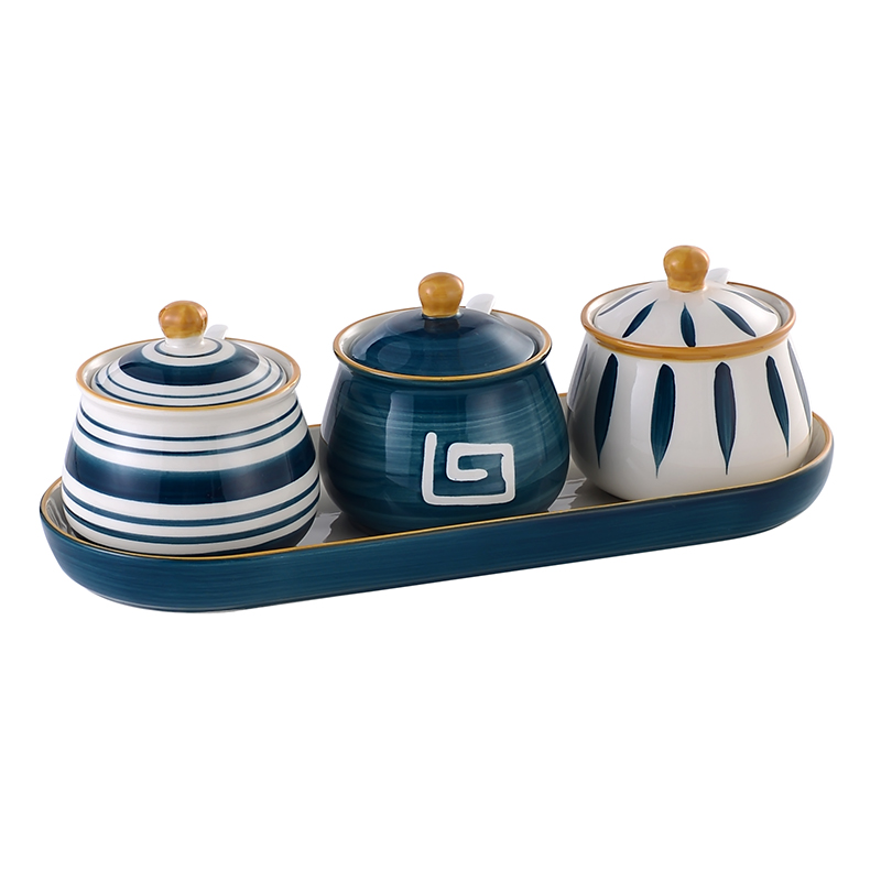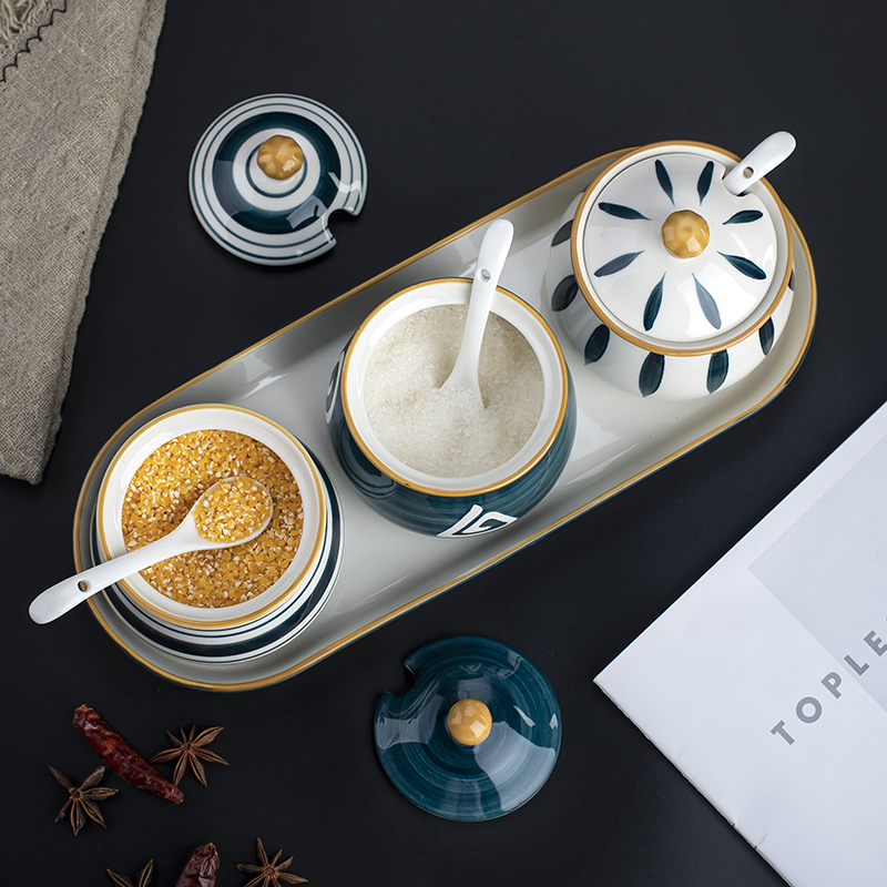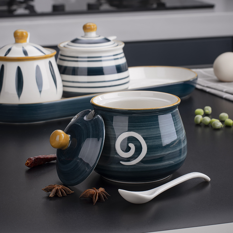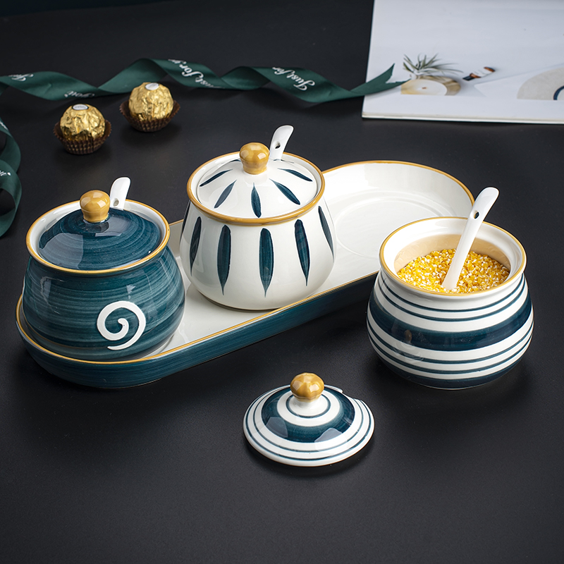Kitchen light luxury ceramic seasoning box set home combined kitchen spoon cover one sealed storage box jar