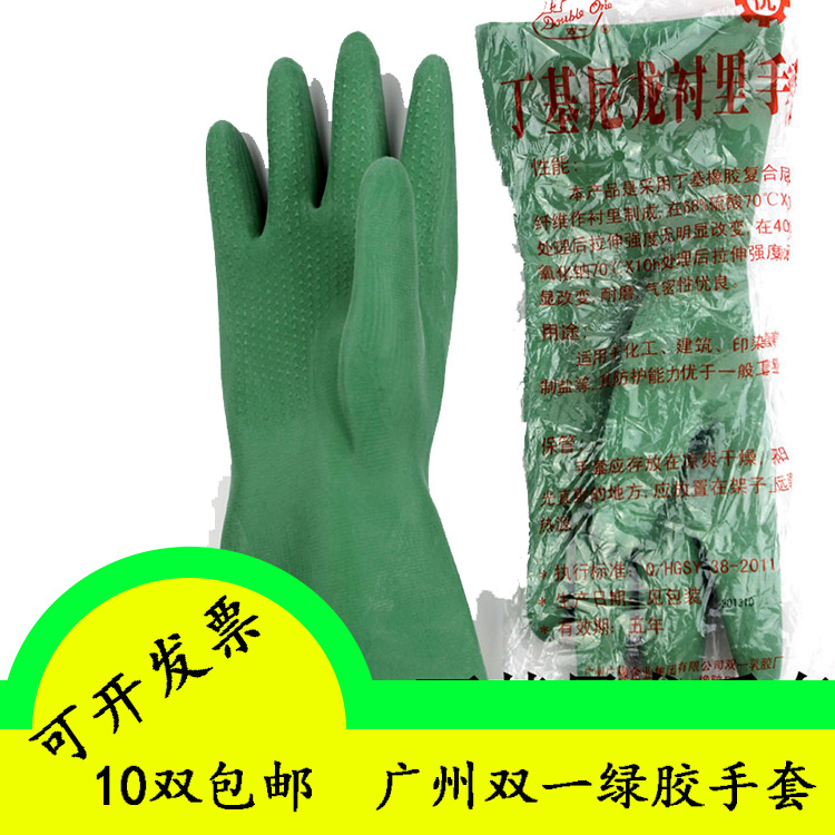 Guangzhou Shuangyi brand butyl nylon lining strong acid and alkali resistant gloves Shuangyi acid and alkali resistant waterproof green rubber gloves