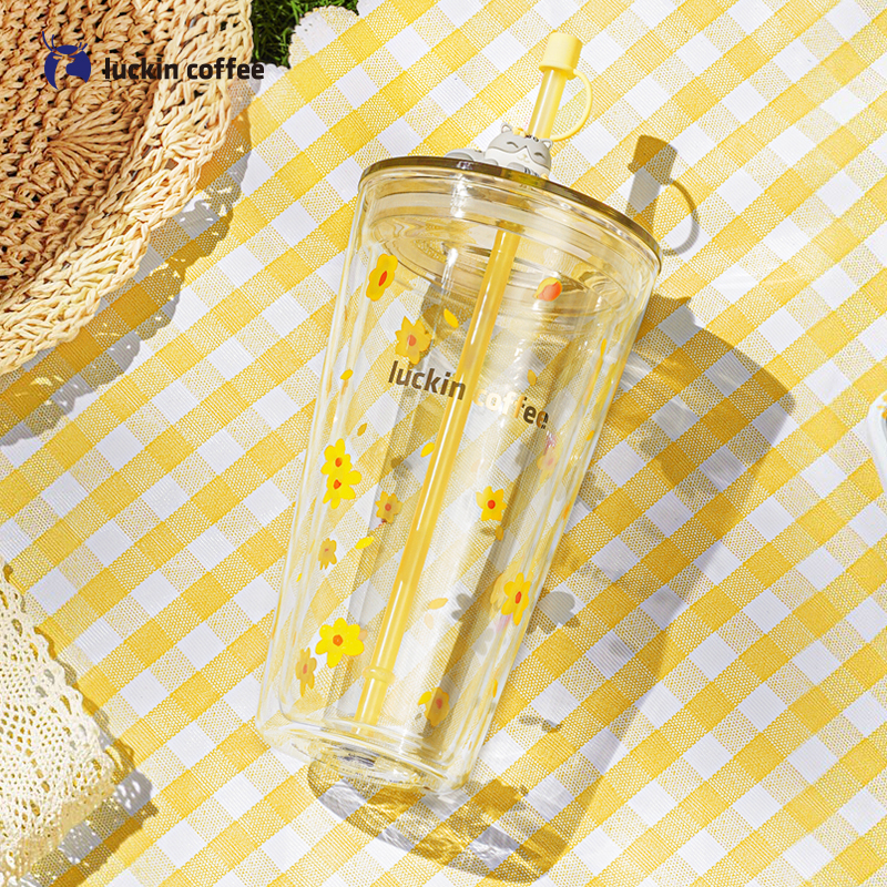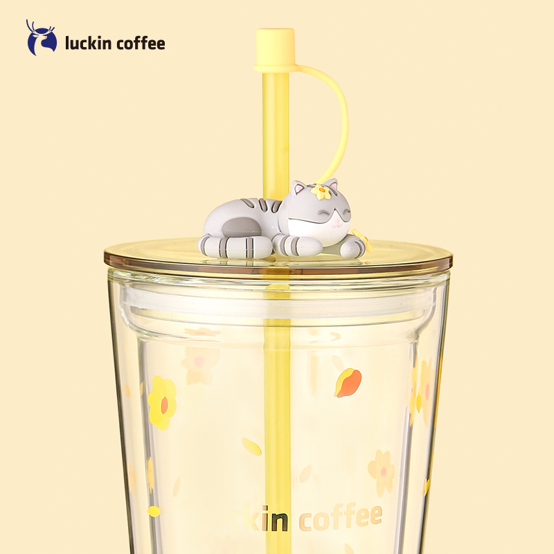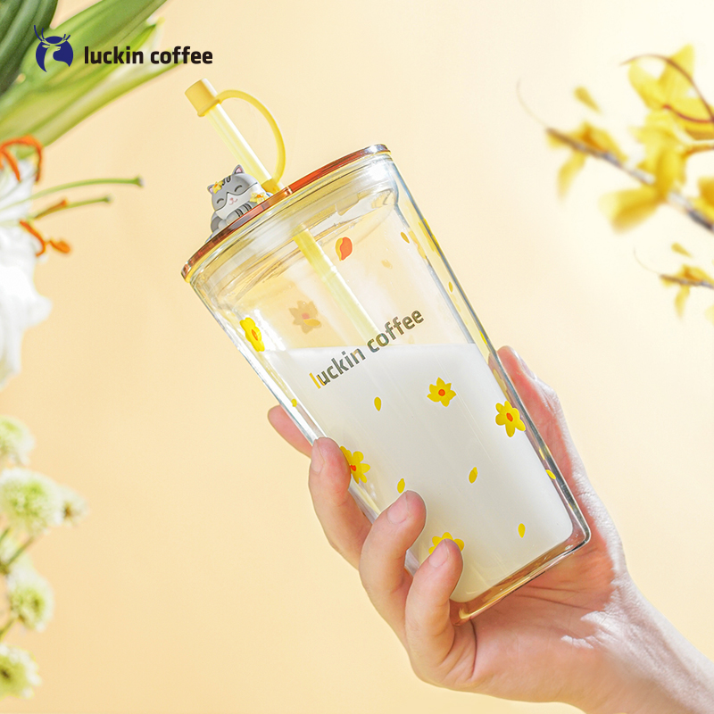 Ruixing coffee flower Meow double-layer glass with straw female cute large capacity insulation anti-hot water cup