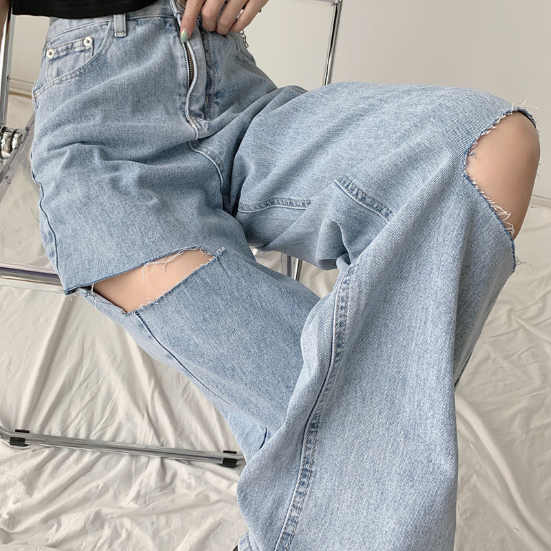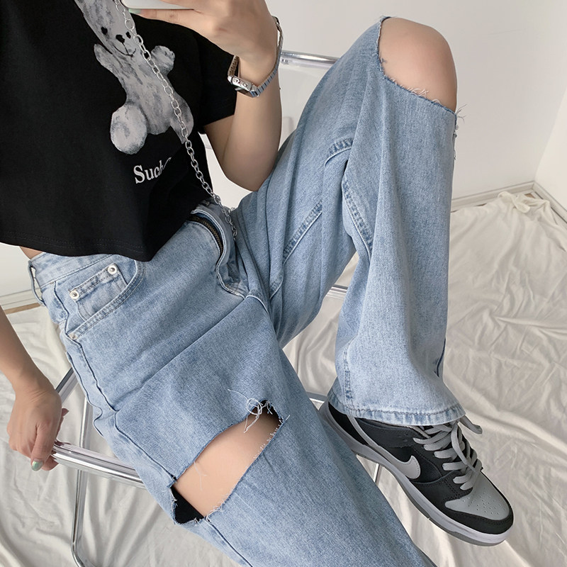 Ripped jeans women's straight loose high-waisted pants fat sister plus size women's autumn clothing 2022 new trendy ins