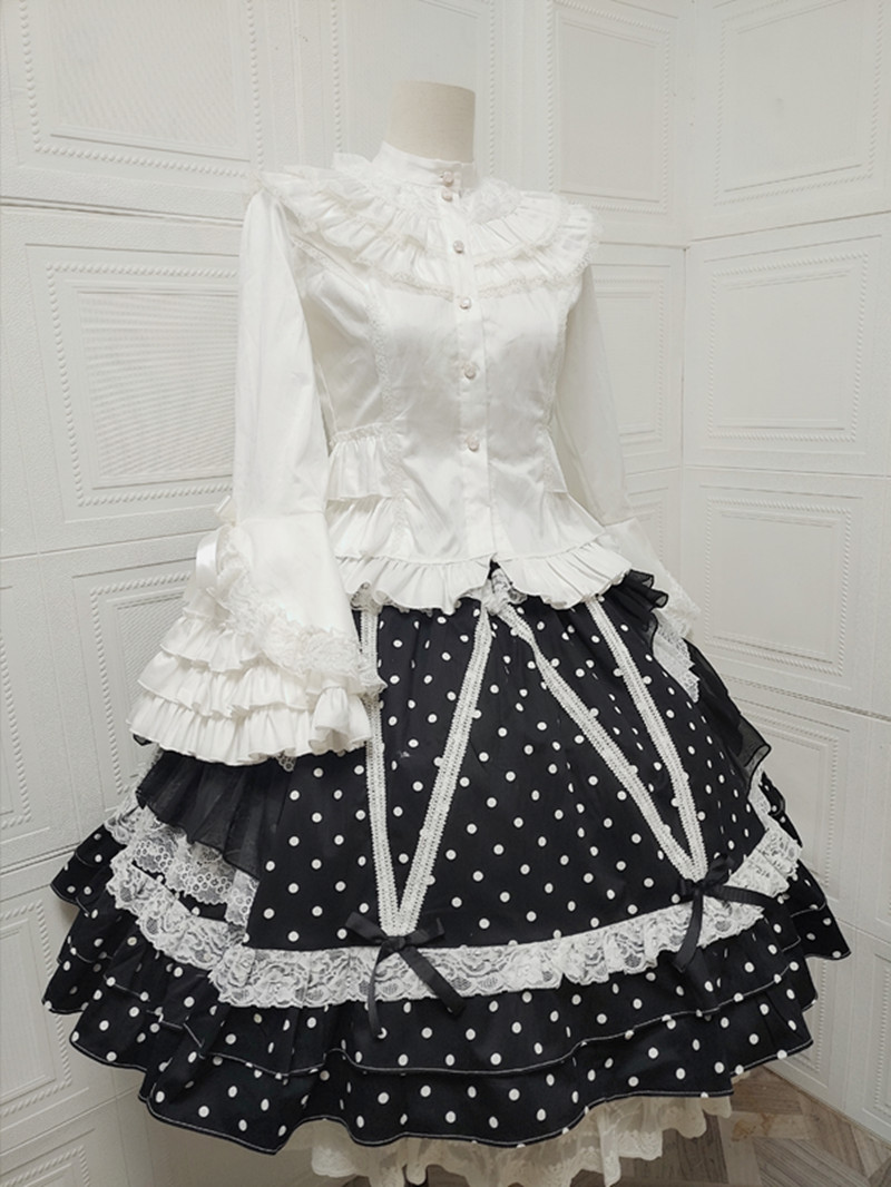 White shirt black shirt light purple half body dress yellow half body dress black half body dress