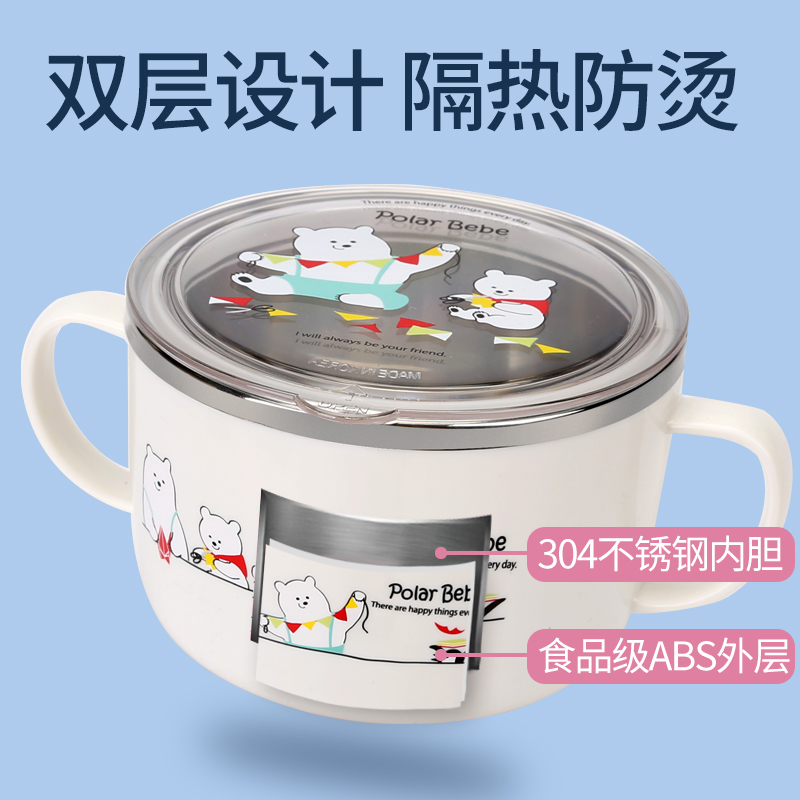 Korean integrated elementary school children's double ear soup bowl 304 stainless steel children anti-burn and fall with lid baby rice bowl cute