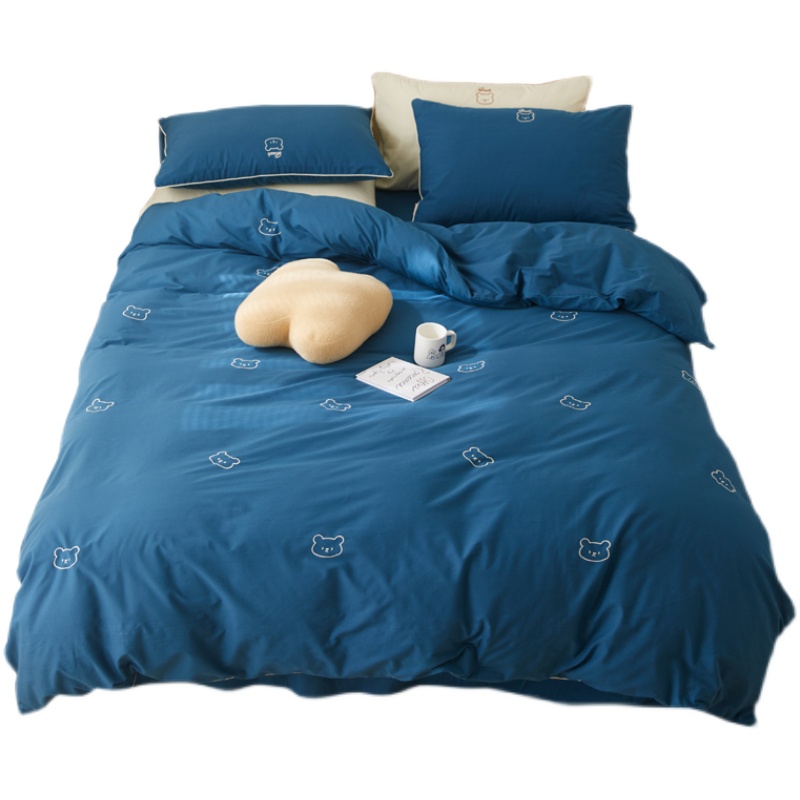 Bear embroidery washed cotton bedding four-piece set cotton pure cotton embroidery quilt cover Solid color spring and summer bed single quilt cover