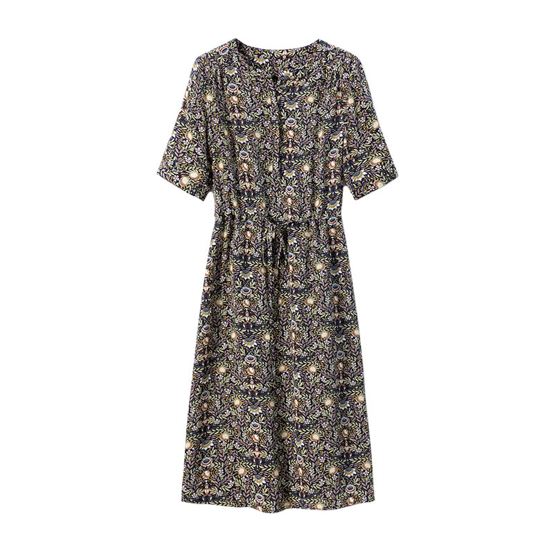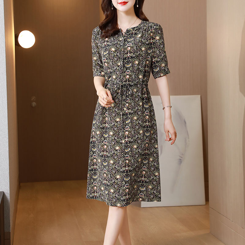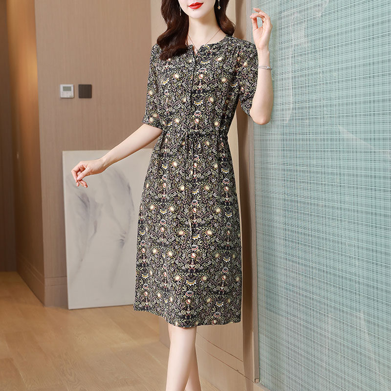 High-end loose crepe de chine silk dress women's summer new round neck short-sleeved mulberry silk floral large size middle-aged dress