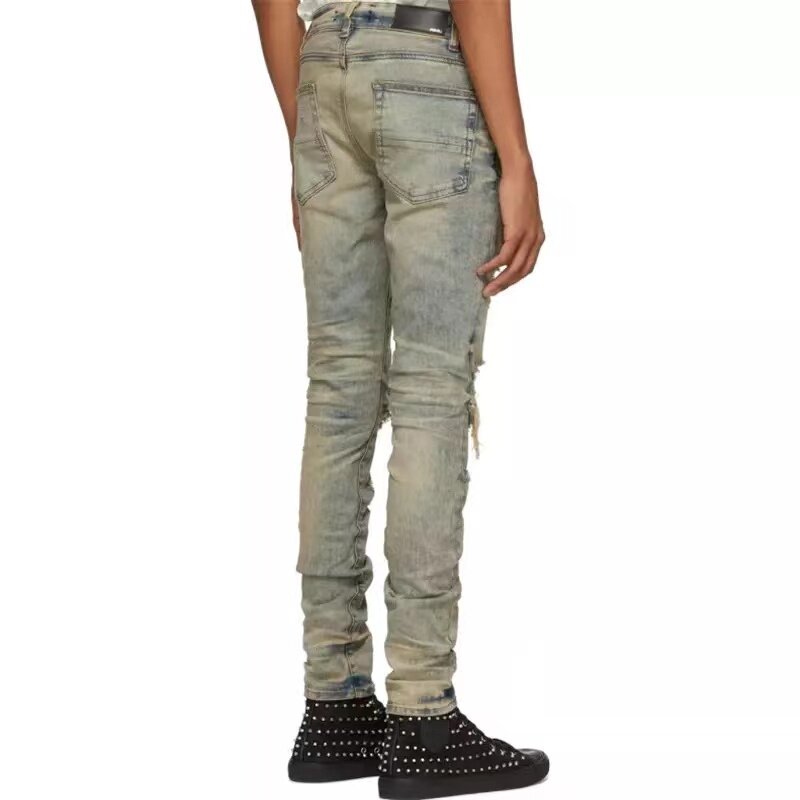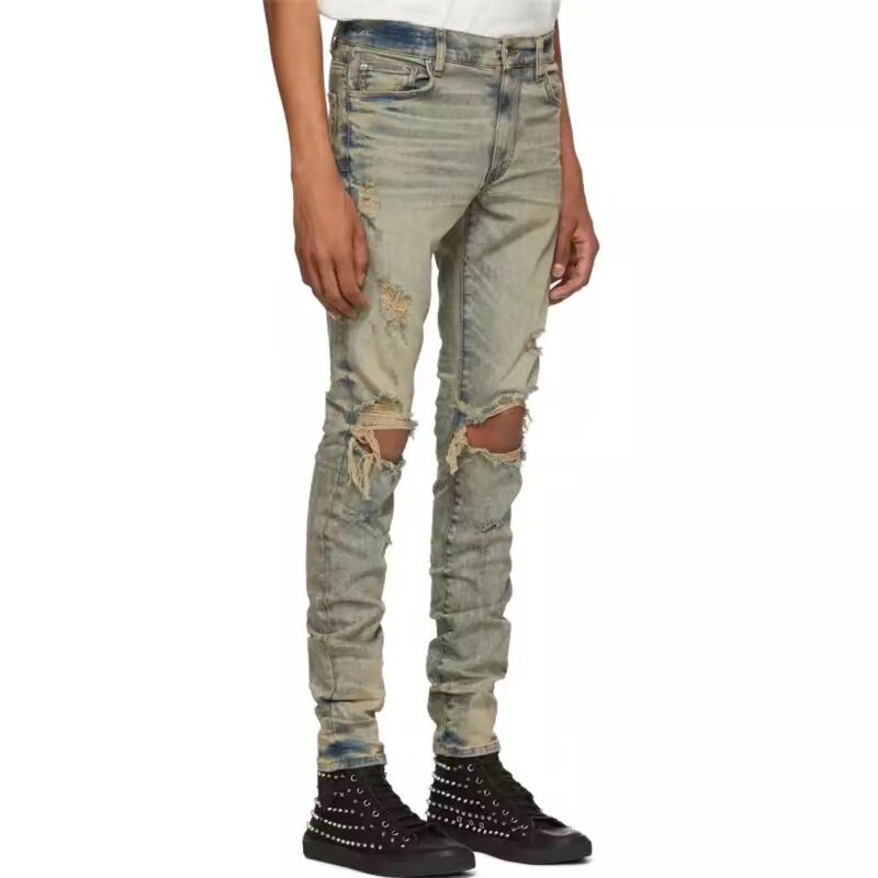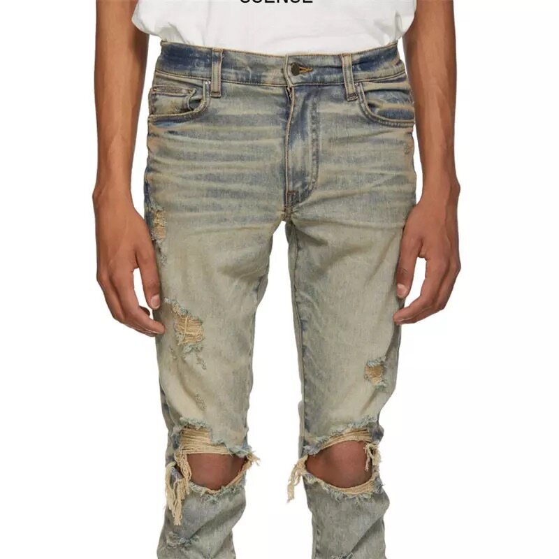 New trendy brand Luo Zhixiang with the same style Amiri 21SS yellow mud to make old double knee hole slim-fit jeans