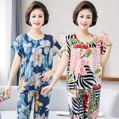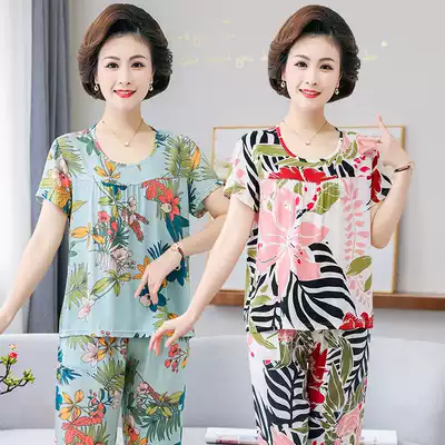 Mom, middle-aged and elderly pajamas, women's summer cotton silk short-sleeved two-piece suit, large size loose artificial cotton, wear home clothes outside