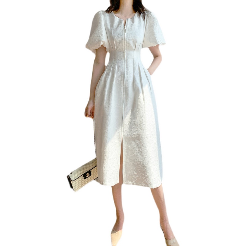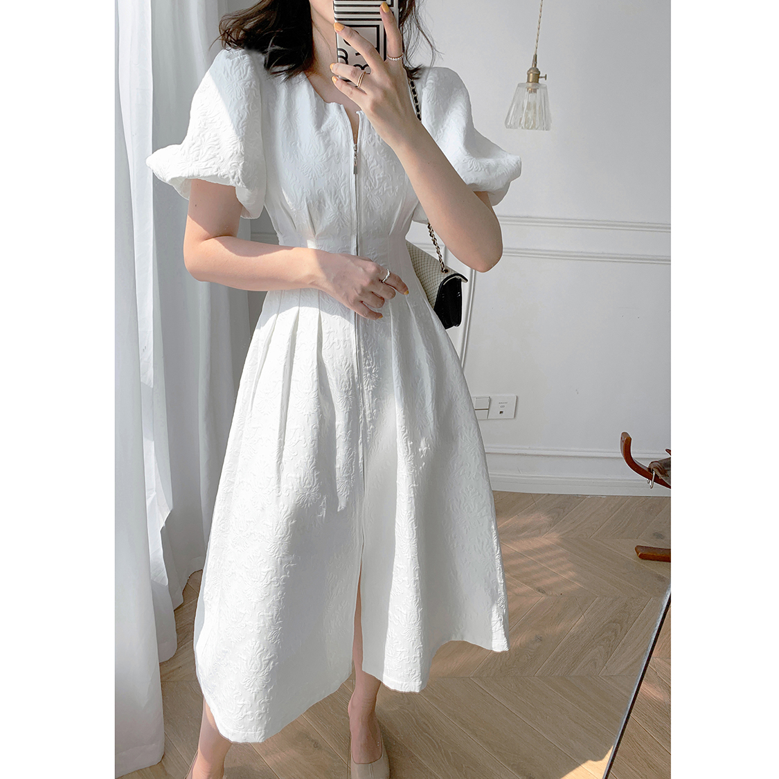 Retro High-end Bubble Sleeves Ocean Dress Women 2021 Summer new gentleness Wind Waist Temperament Round Collar A dresses