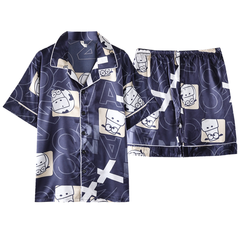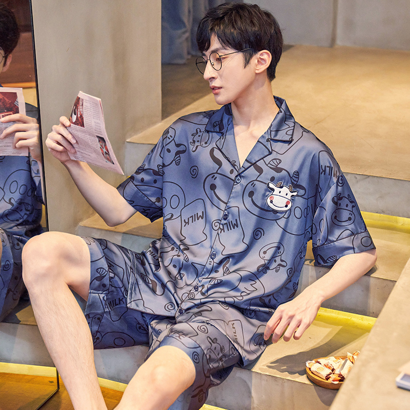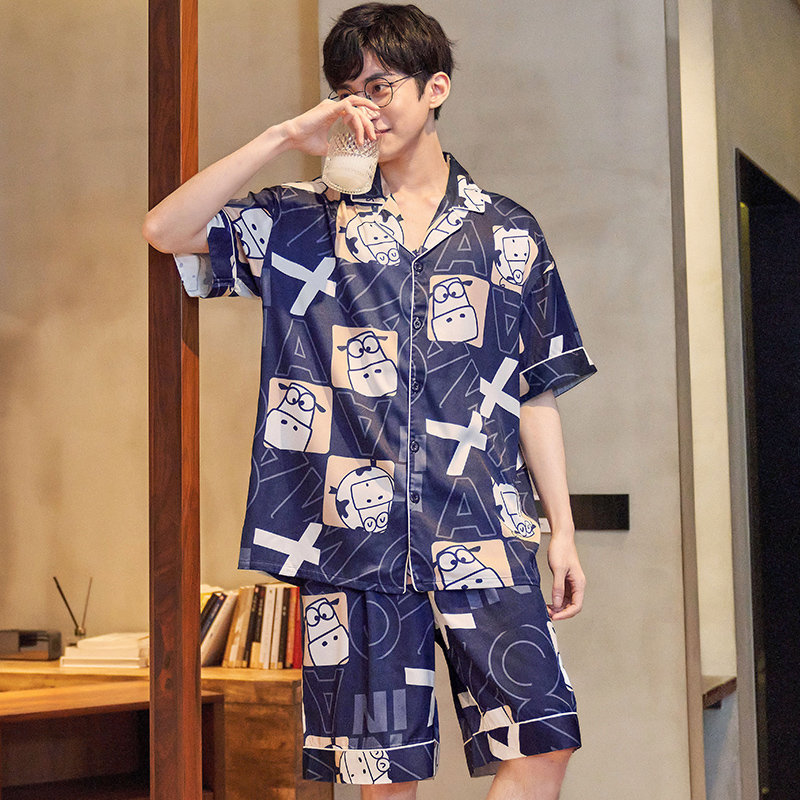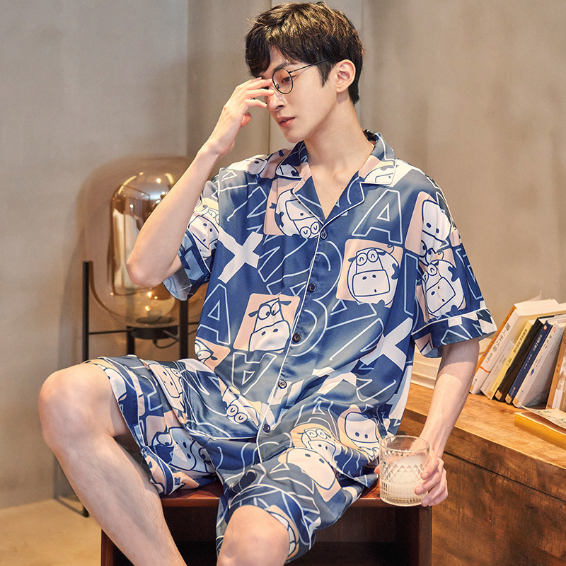 Net Red Ice Silk Short Sleeve Pyjamas Men 2022 New Summer Summer Thin Cartoon Silk Home Conserved Suit