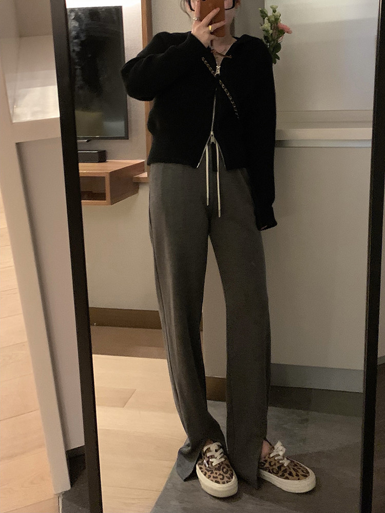 VEEE summer thin high waist loose thin straight tube hanging casual front slit sweatpants women's drawstring bifurcated pants