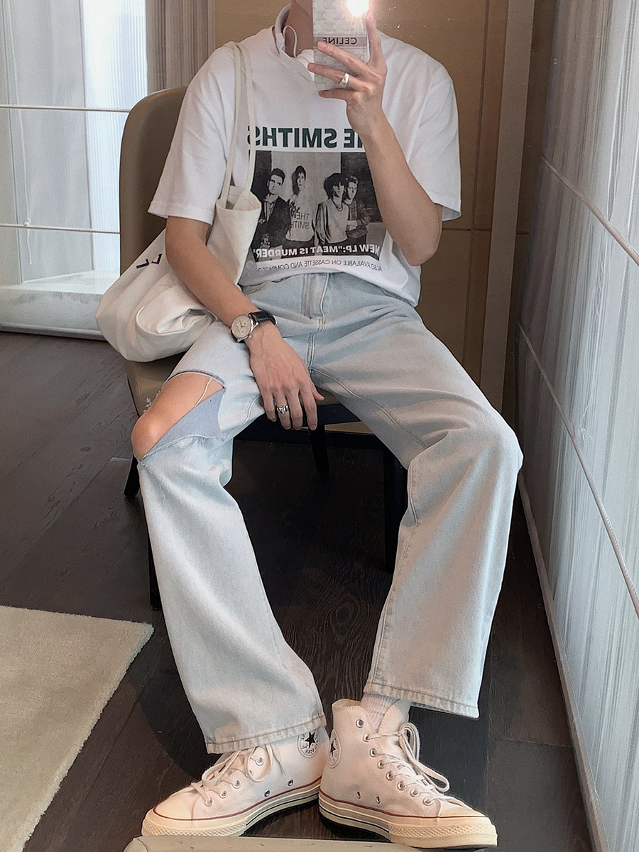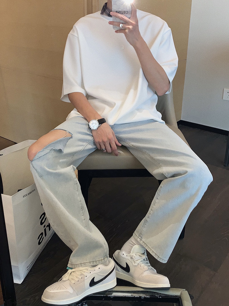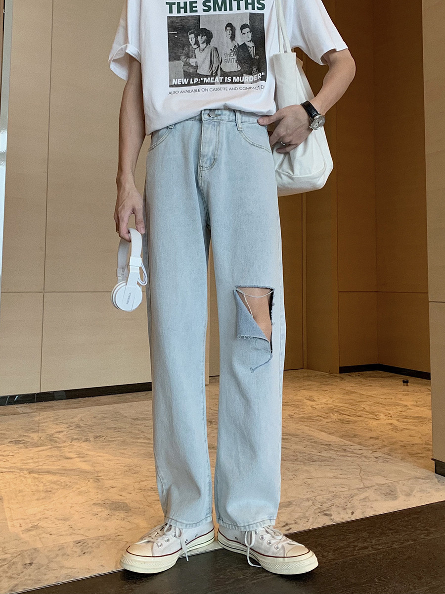 Hualun summer thin ice oxygen bar ripped jeans men's beggar trousers light-colored tide broken loose straight-leg pants
