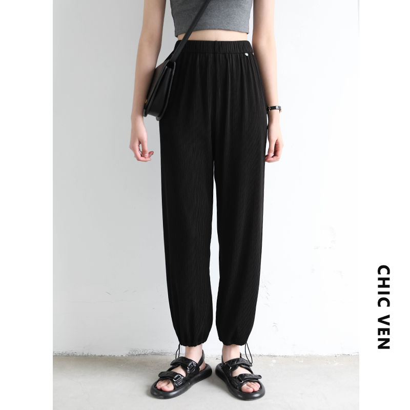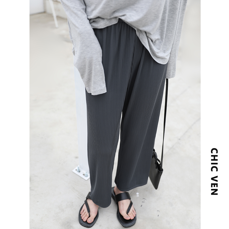 CHICVEN "Island" Street Casual Vertical Pit Strip Leg Pants Women's Wide Leg Elastic Waist Straight Pants Look Thin