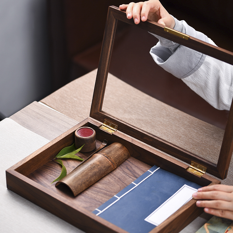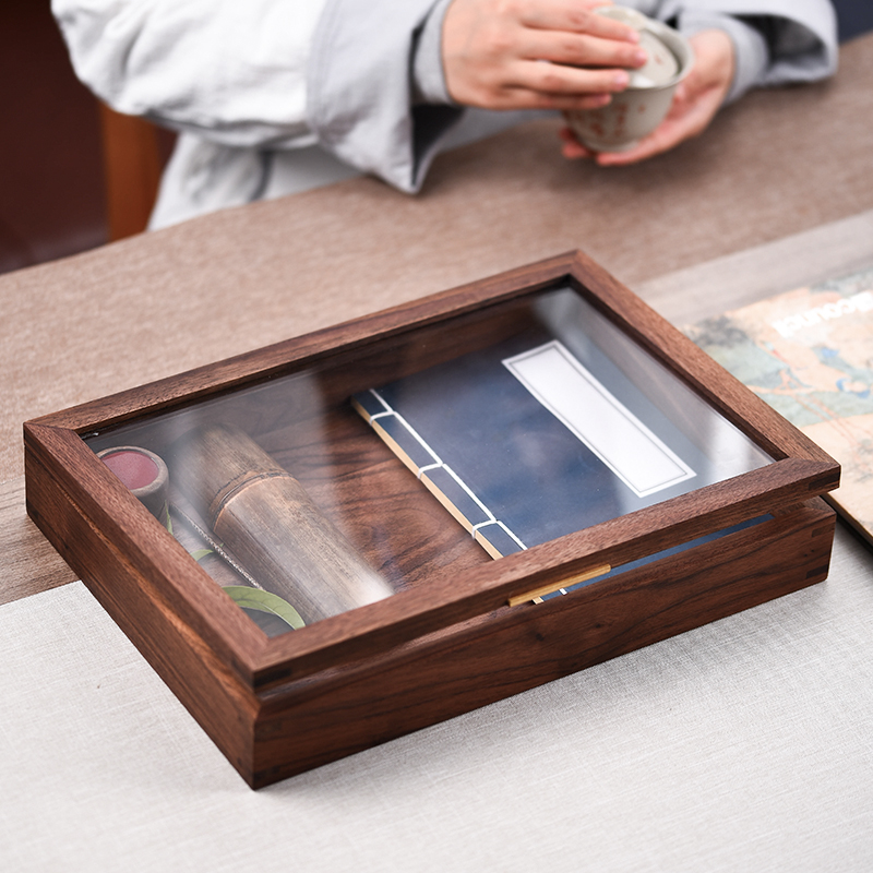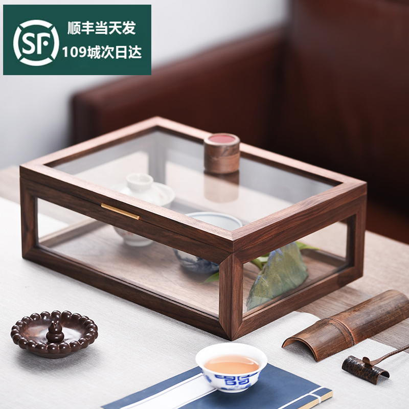 North American black walnut dust-proof transparent five-sided glass tea set display box jewelry storage solid wood display box