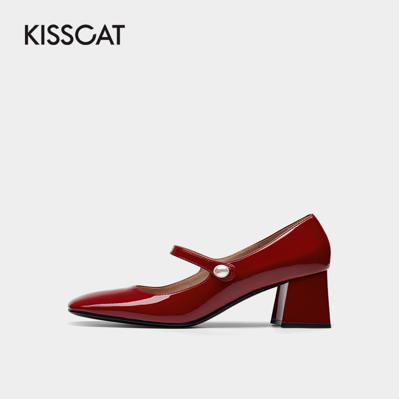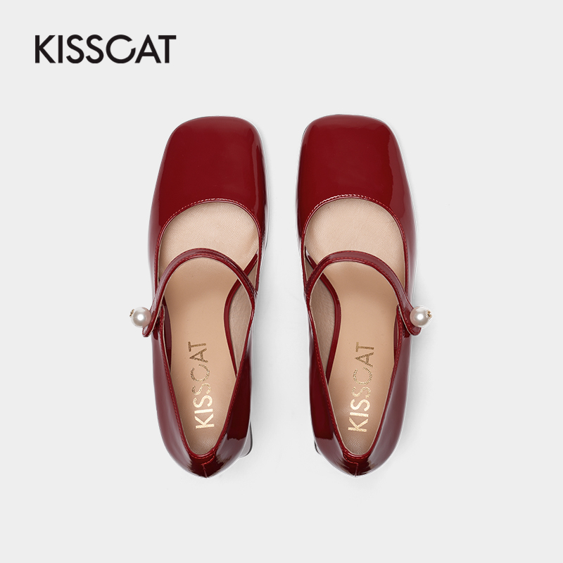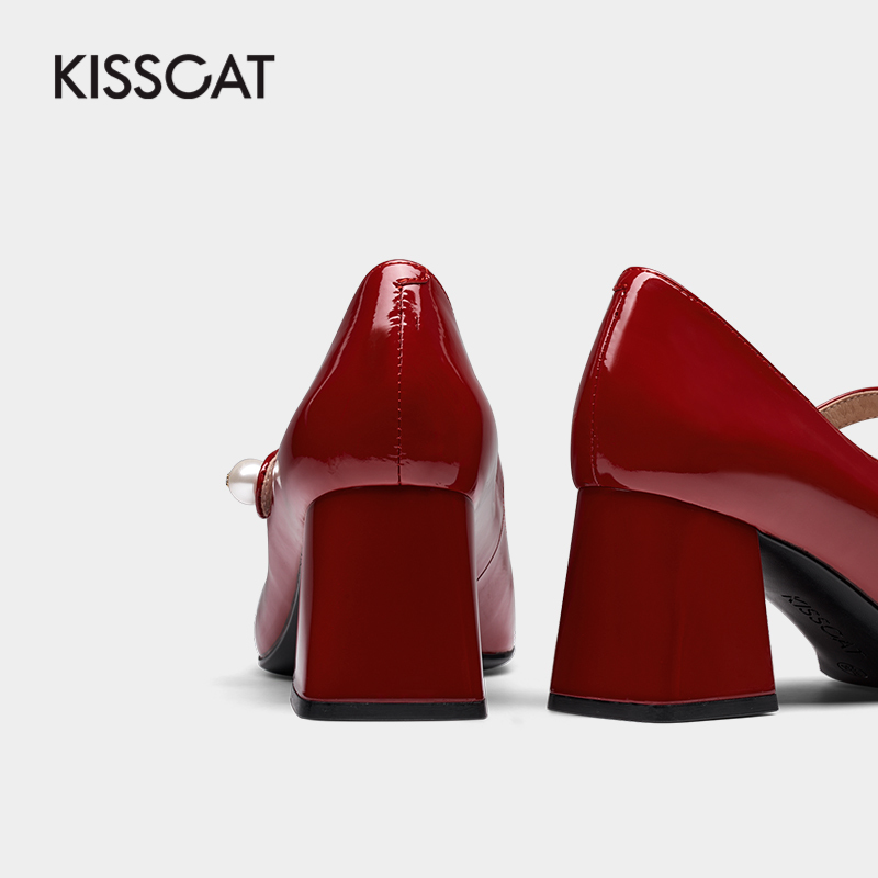 Kissing cat lady shoes spring autumn season new pop square head coarser with sweet and sweet pearl Mary Jane shoes little leather shoes
