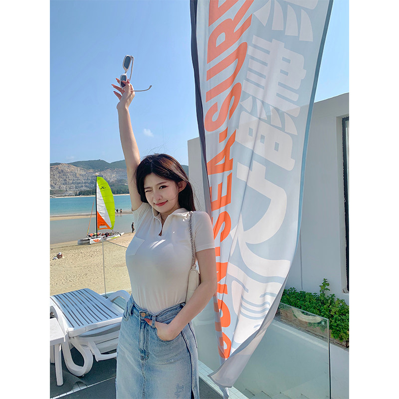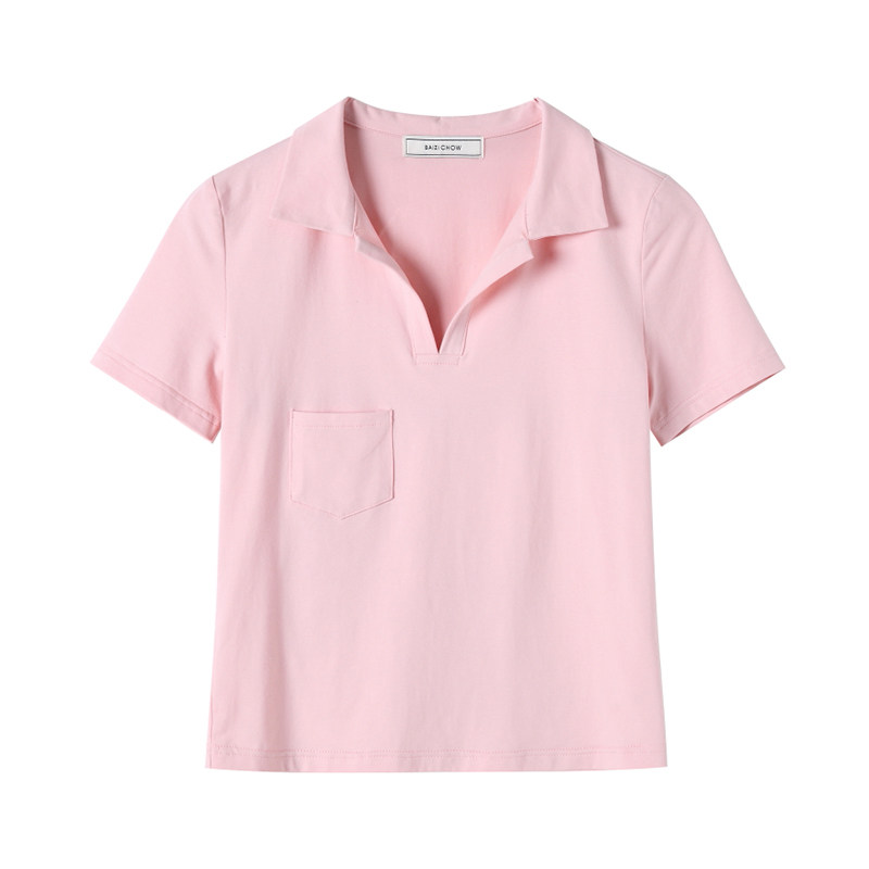 Zhou Baizi FORYOU 2023 new polo collar small open collar big code pure color short sleeve T-shirt blouse slim and thin
