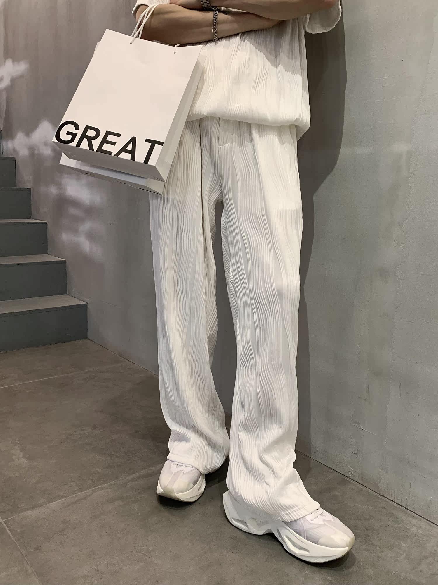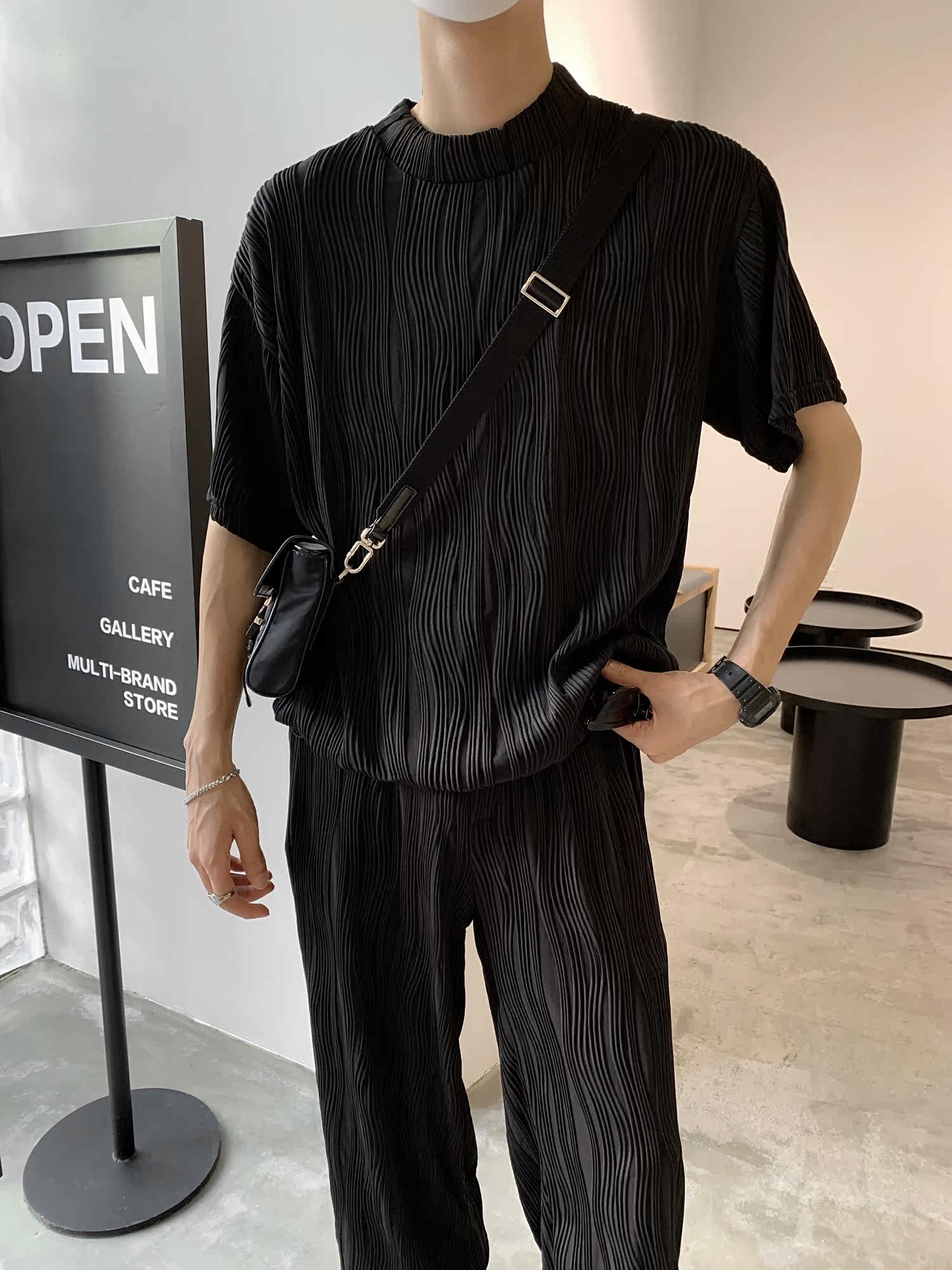 Value Clearing # Summer Frying Street Han Fold Design Fall Feeling Vertical Strip Casual Short Sleeve T - Shirt Set Men