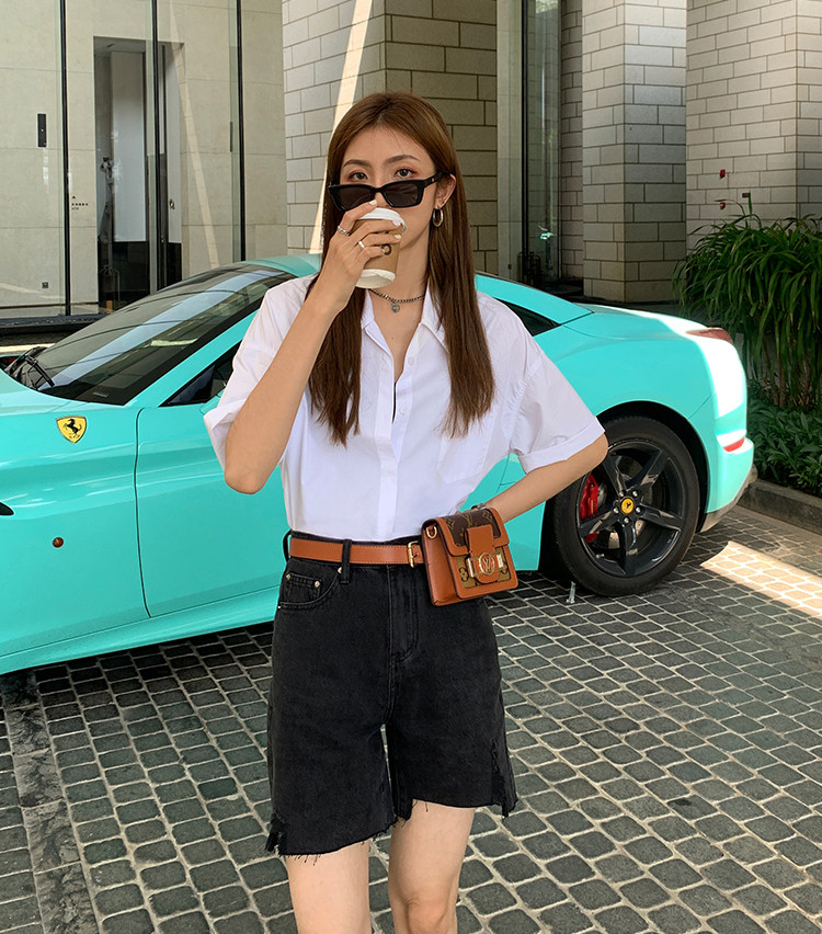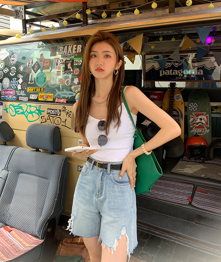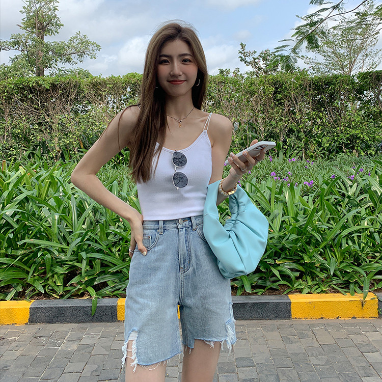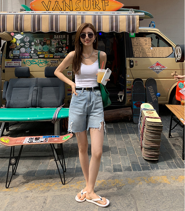 Korean denim shorts women's thin section 2022 new summer break hole high waist straight cylinder loose with slim hair side 50% pants