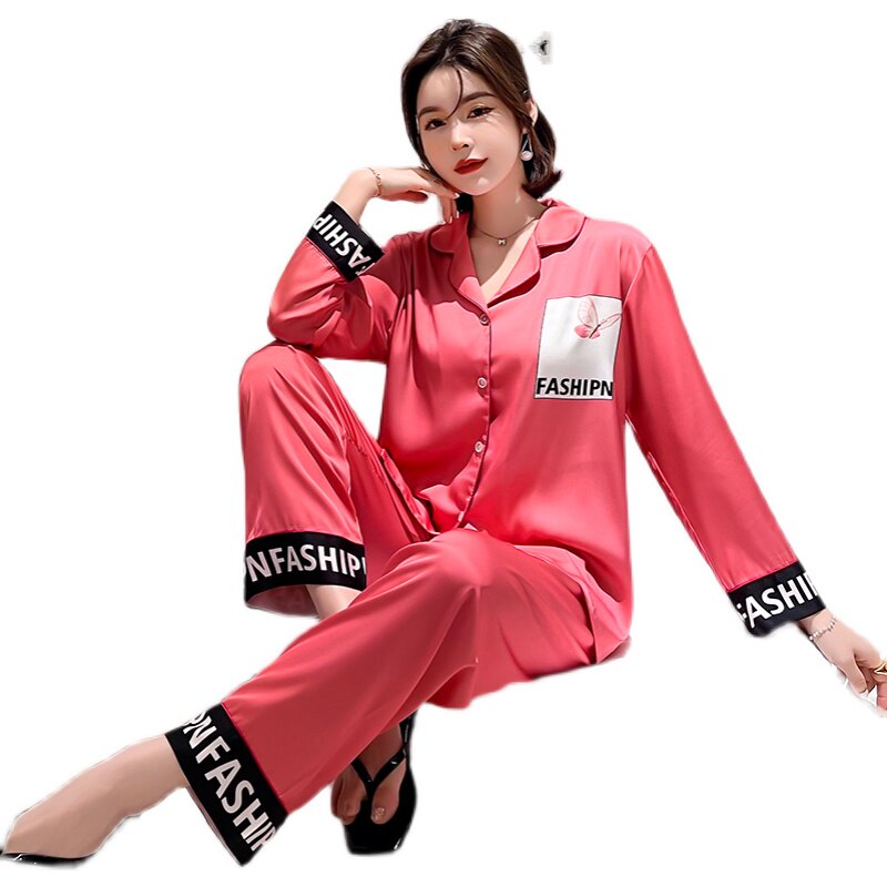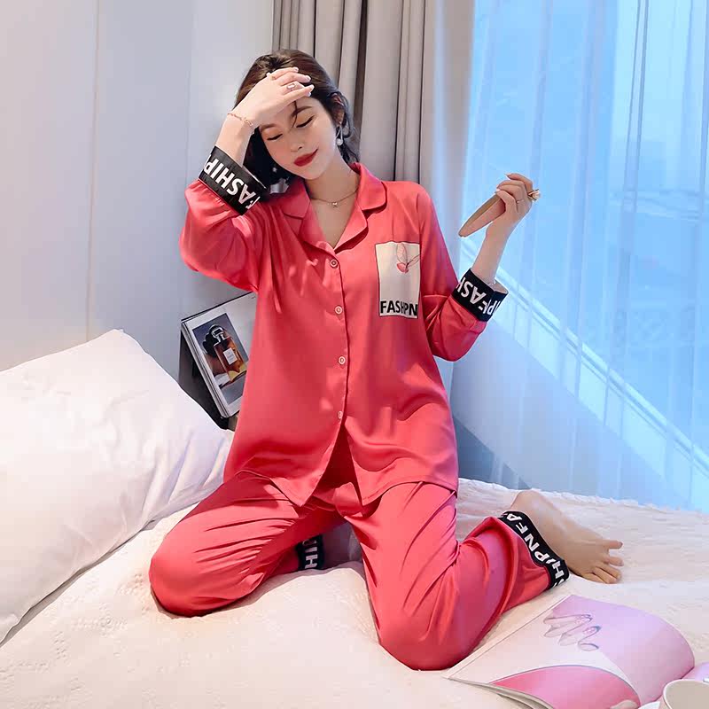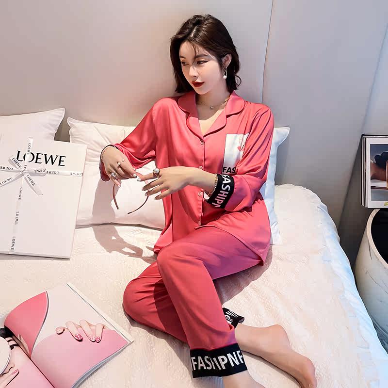 Long sleeve pyjamas ladies ice silk cardiovert summer thin style suit Spring and autumn individuality loose Korean version Temperament Home Clothing