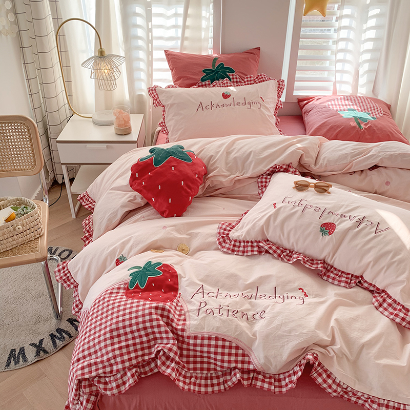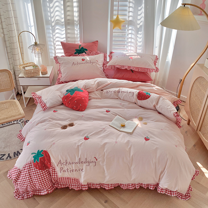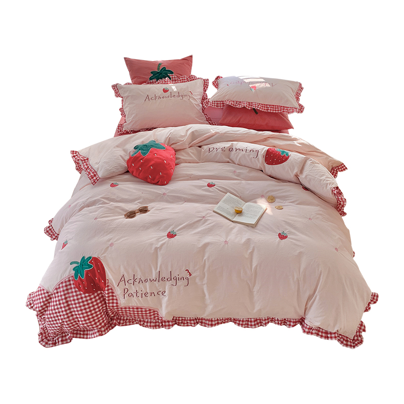 (Toyama Strawberry) Princess Wind Cotton Washed Cotton Four-piece Set Cotton Embroidery Strawberry Quilt Cover Girl Heart Sheet