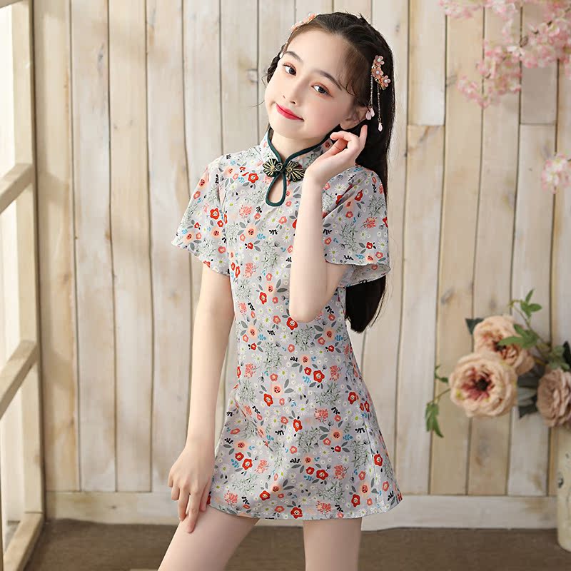 Girls Chinese style thin section improved cheongsam dress children's Western style Chinese high-end Tang suit costumes summer floral