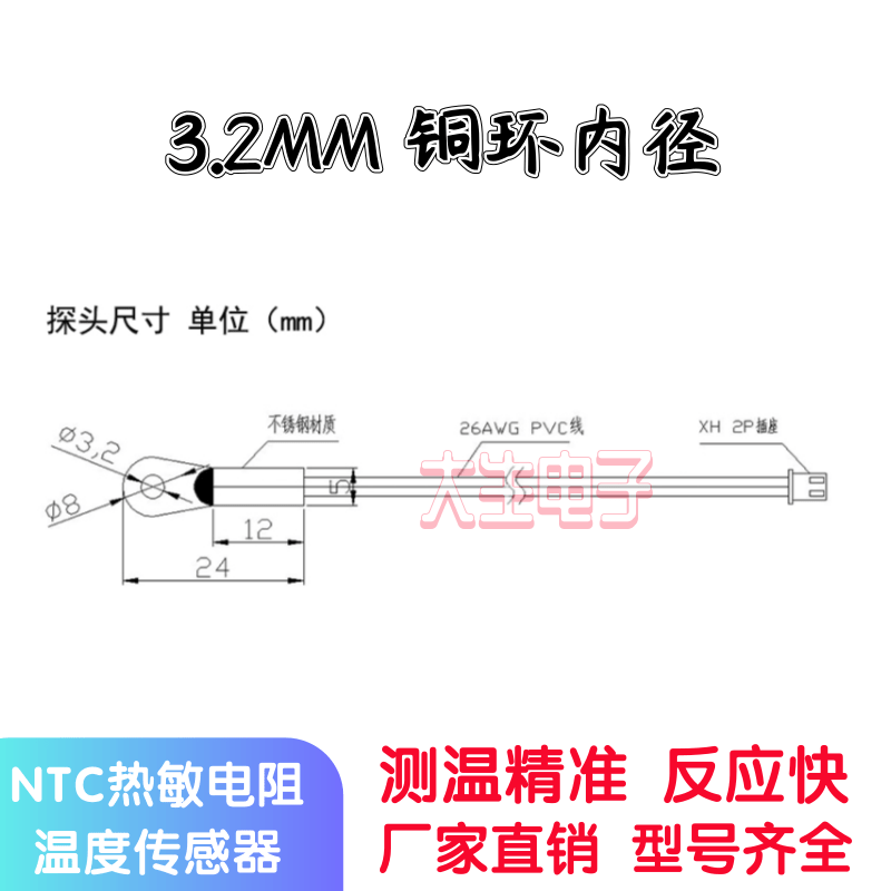 3.2mm copper ring inner diameter 100K 1% 3950XH2.54 terminal NTC temperature sensor line length 90MM